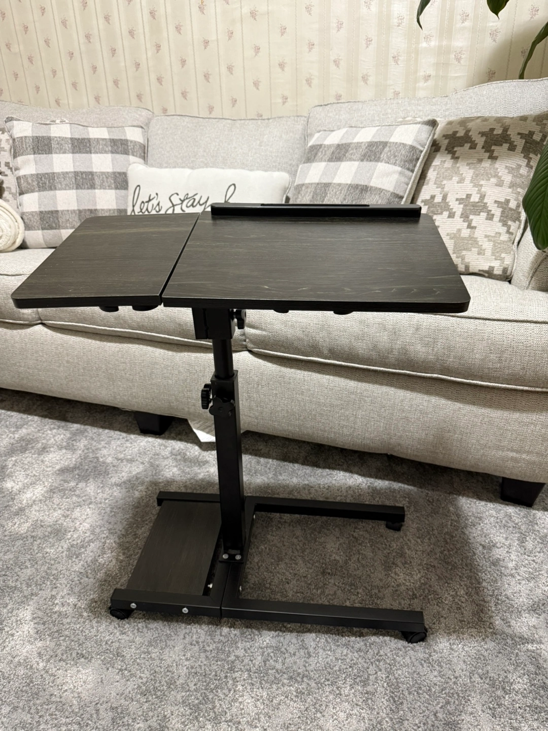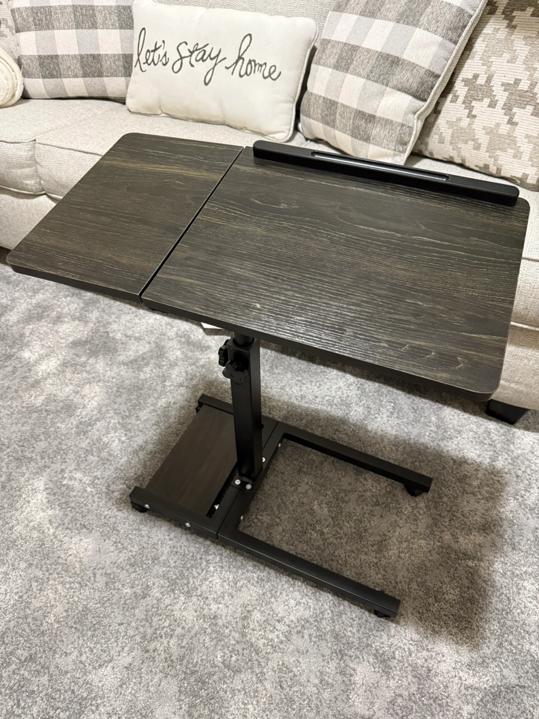 Selling an adjustable height laptop desk that's perfect for working from home! It’s in great condition and ready for a new owner. The desk is a dark wood color and has a sturdy metal frame. It's easy to adjust the height to your preferred level, whether you're sitting or standing. It also has wheels, making it easy to move around your space