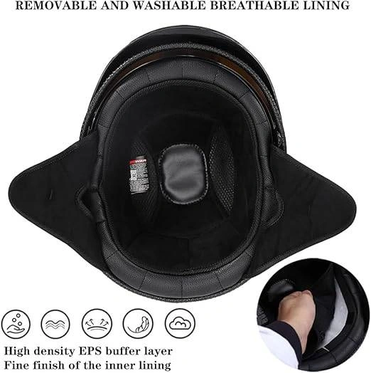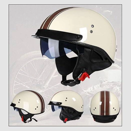 10🏍️ Professional Motorcycle Half Helmet – Beige with Brown Stripes DOT Approved Safety: Ride with confidence! Our premium half helmet meets all U.S. DOT safety standards and has passed rigorous market safety tests. Designed for both men and women, it’s perfect for motorcycles, cruisers, choppers, racing, scooters, mopeds, and touring. Durable & Stylish Construction: Crafted with a high-strength ABS shell and a shock-absorbing EPS inner liner, this helmet delivers superior protection and impact resistance. The built-in sun visor shields your eyes from glare—no need for extra goggles—while adding a sleek, modern look. Lightweight & Easy to Use: Featuring a quick-release buckle, this helmet ensures a secure fit and can be fastened or removed effortlessly with one hand. Comfortable Fit: The adjustable fine-tuning strap allows for a personalized, snug fit. The breathable technical fabric interior keeps you cool and comfortable on every ride, with soft padding for added protection.