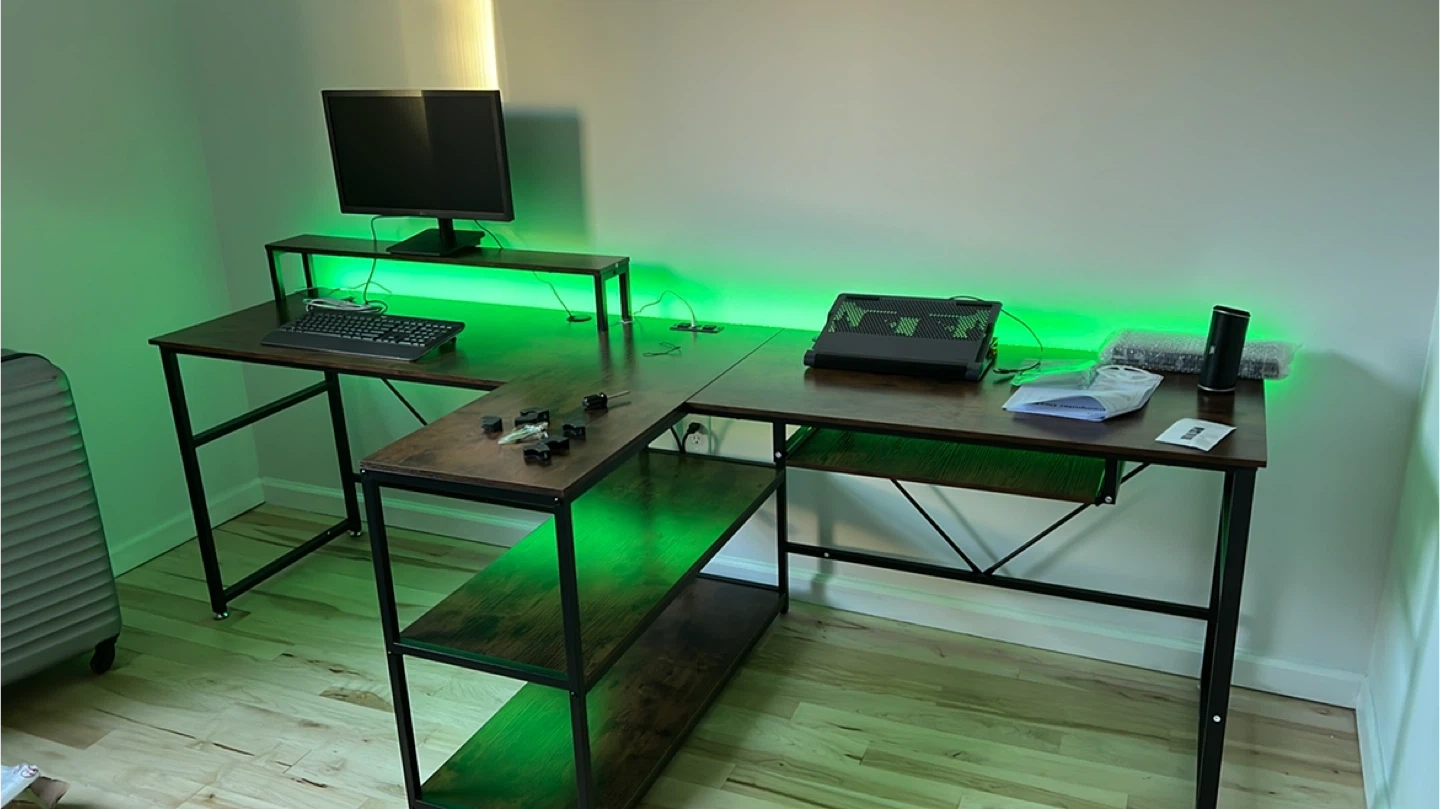 This is a Double Computer desk that's perfect for a home office or gaming setup. It features shelves for storage and a sleek design. The desk has a brown wood-grain top with a black metal frame. It's in great condition and ready for a new home