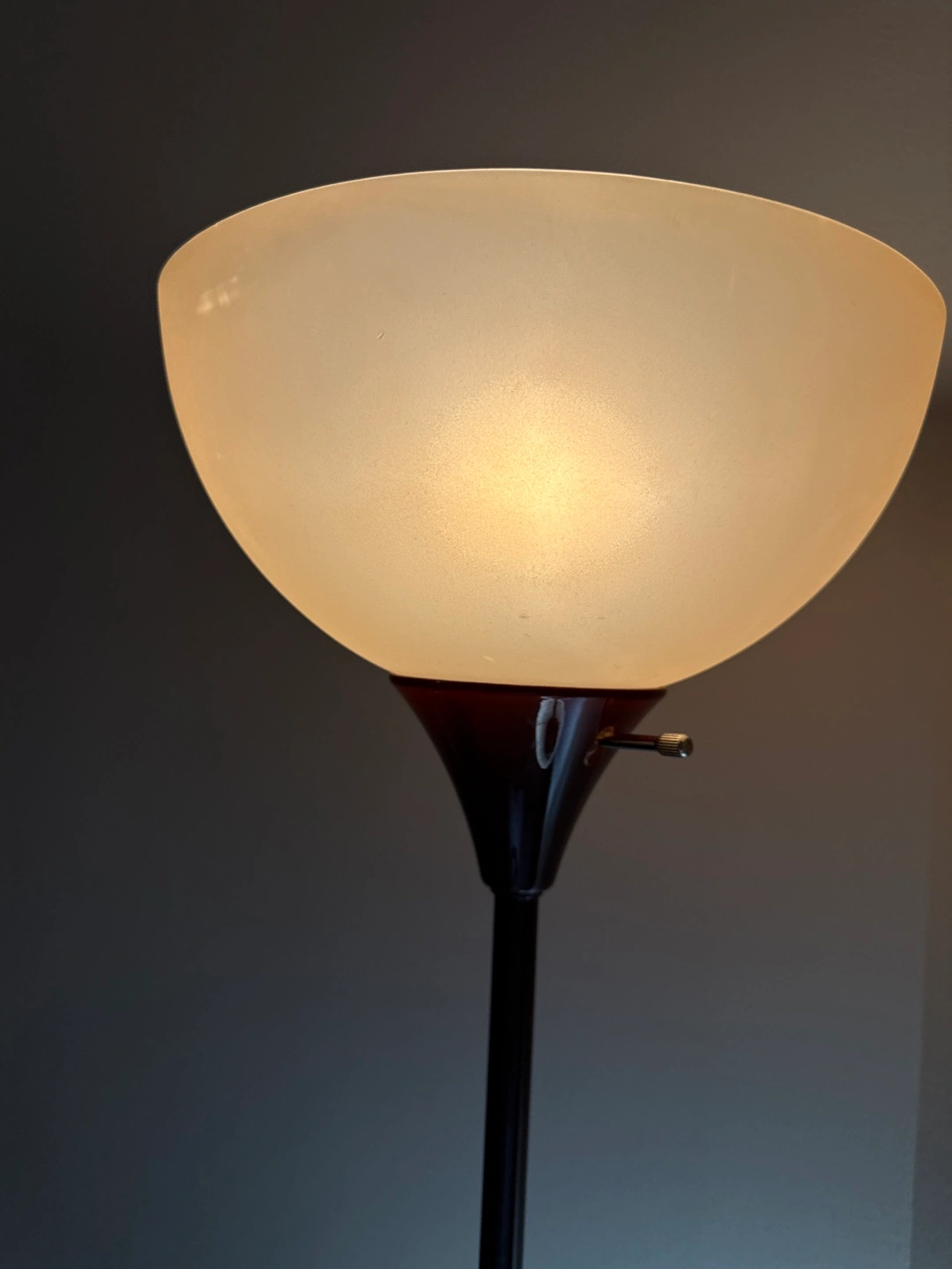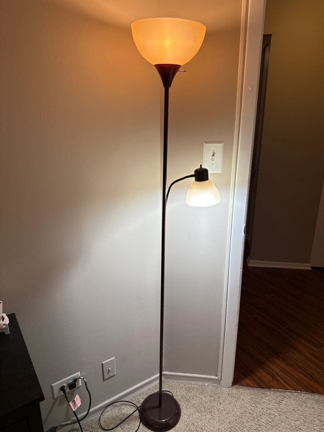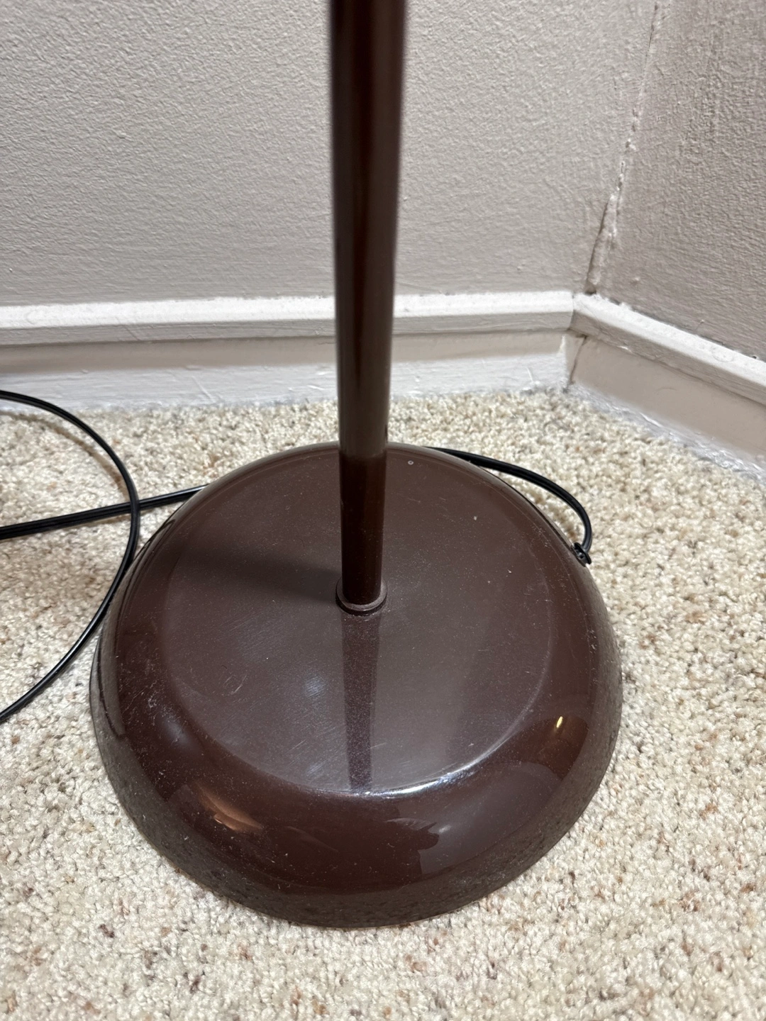114Tall brown floor lamp. Two frosted plastic shades. Adjustable swing-arm lamp. Works perfectly fine.