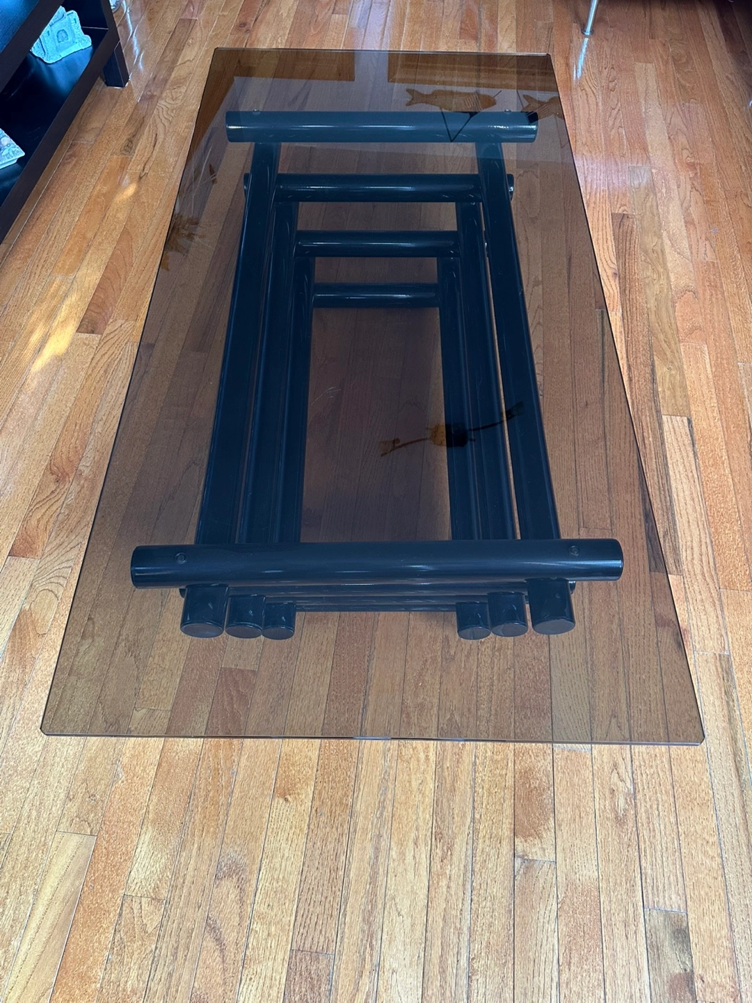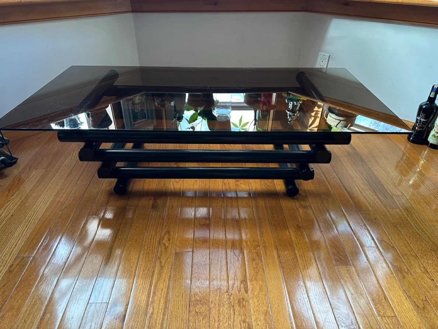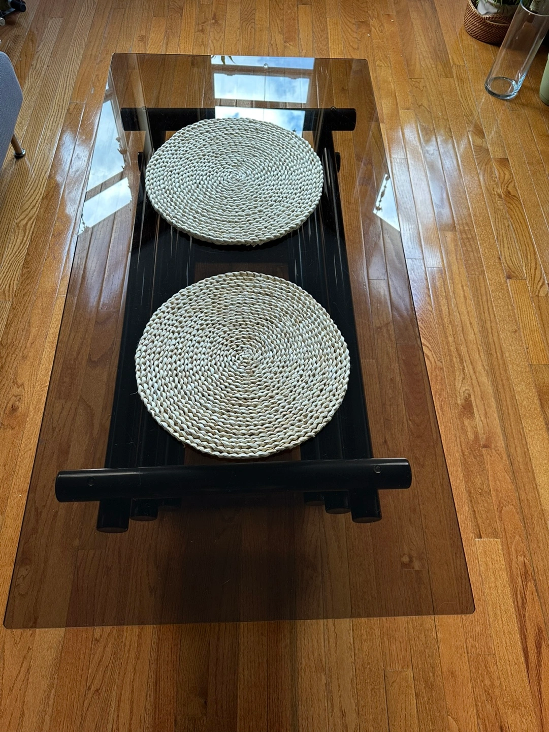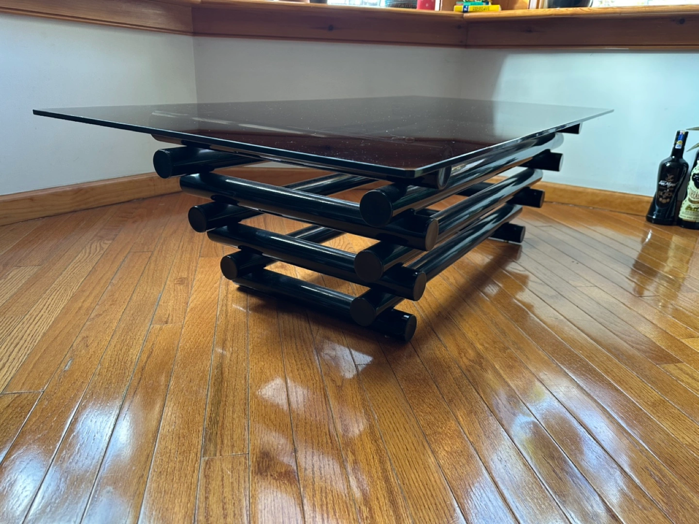 Sleek glass top coffee table. Black lacquered wood frame. Unique design. Perfect for a modern living room. Top glass slightly scratched.