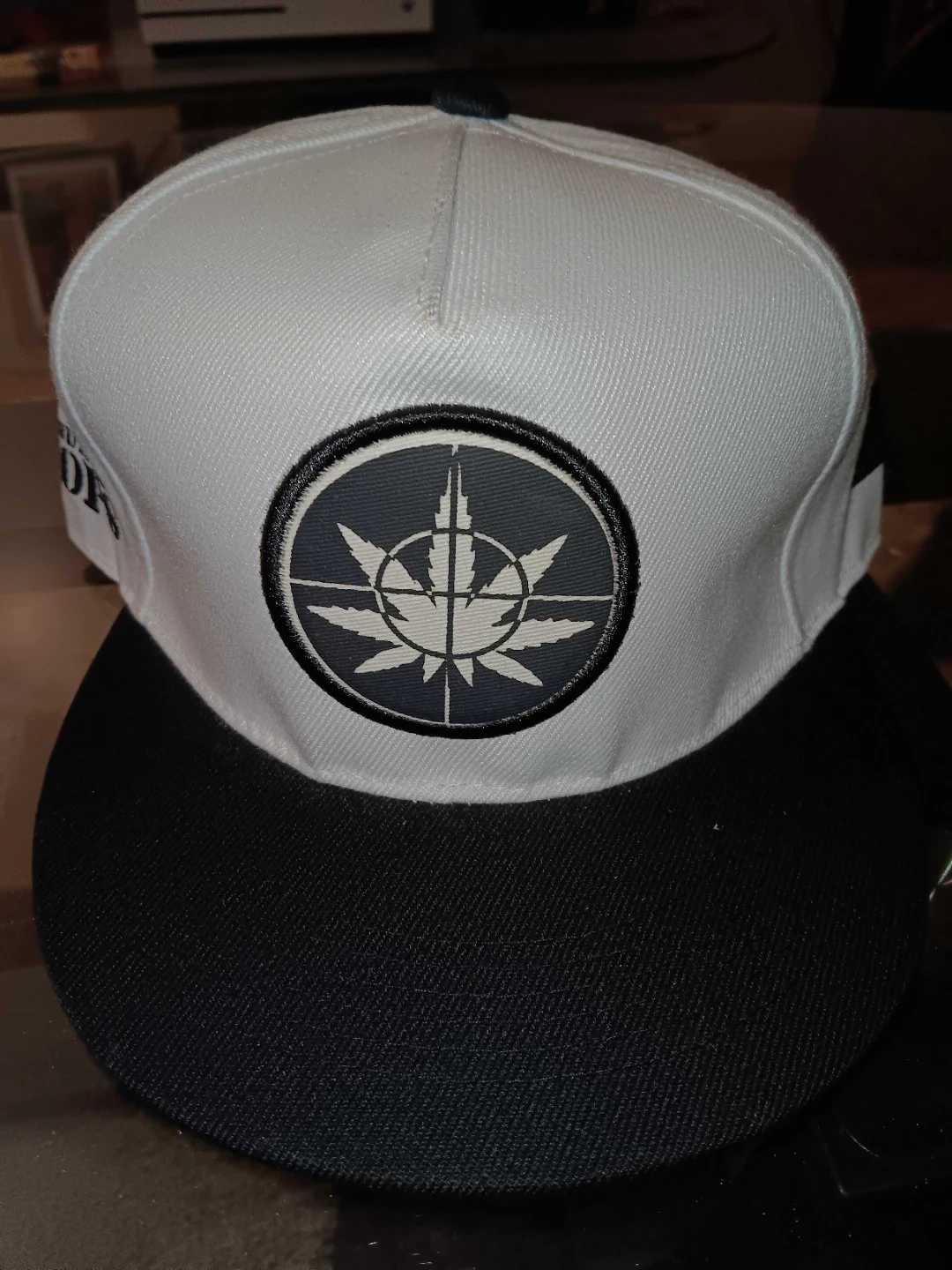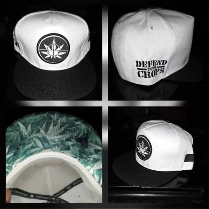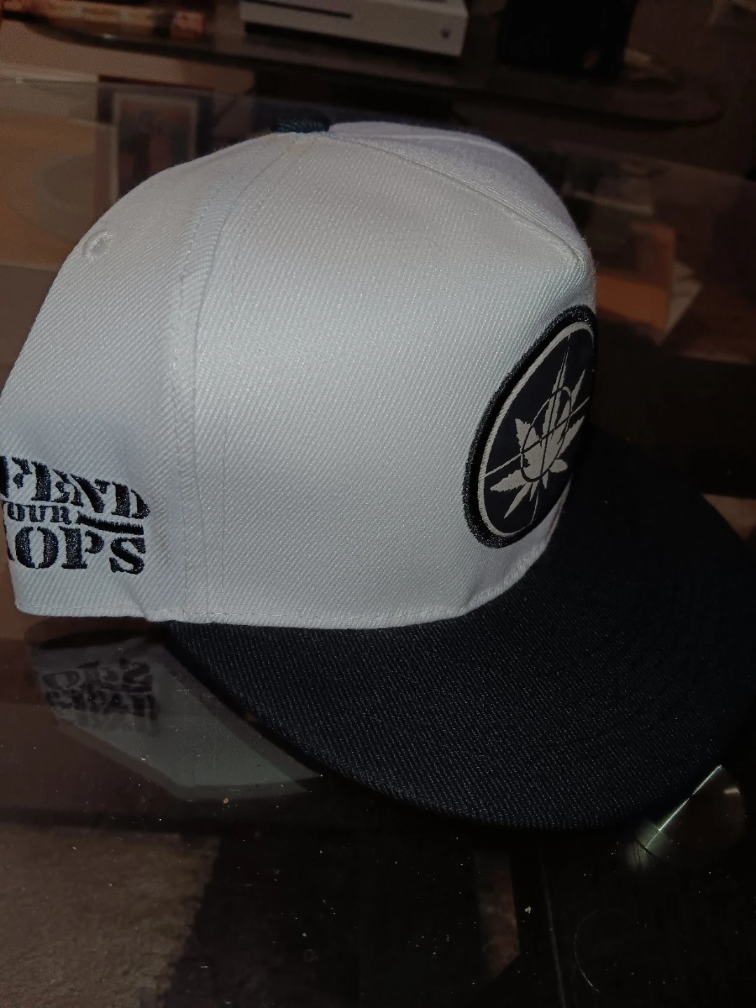 This snapback hat features a white crown and a black brim. It has a circular embroidered logo on the front and text that reads 'DEFEND YOUR CROPS' on the side. It's a stylish accessory for anyone who appreciates unique headwear.