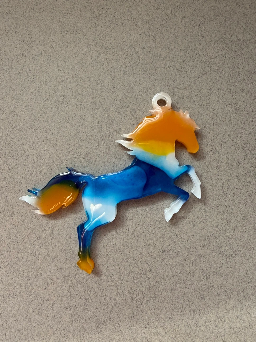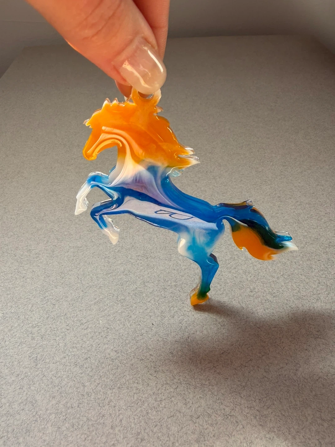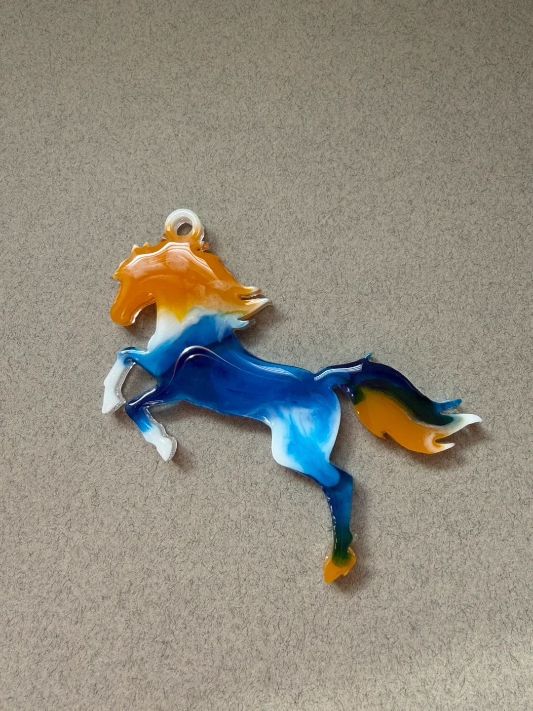 Handmade resin mustang charm with a vibrant multicolor gradient and glossy finish.