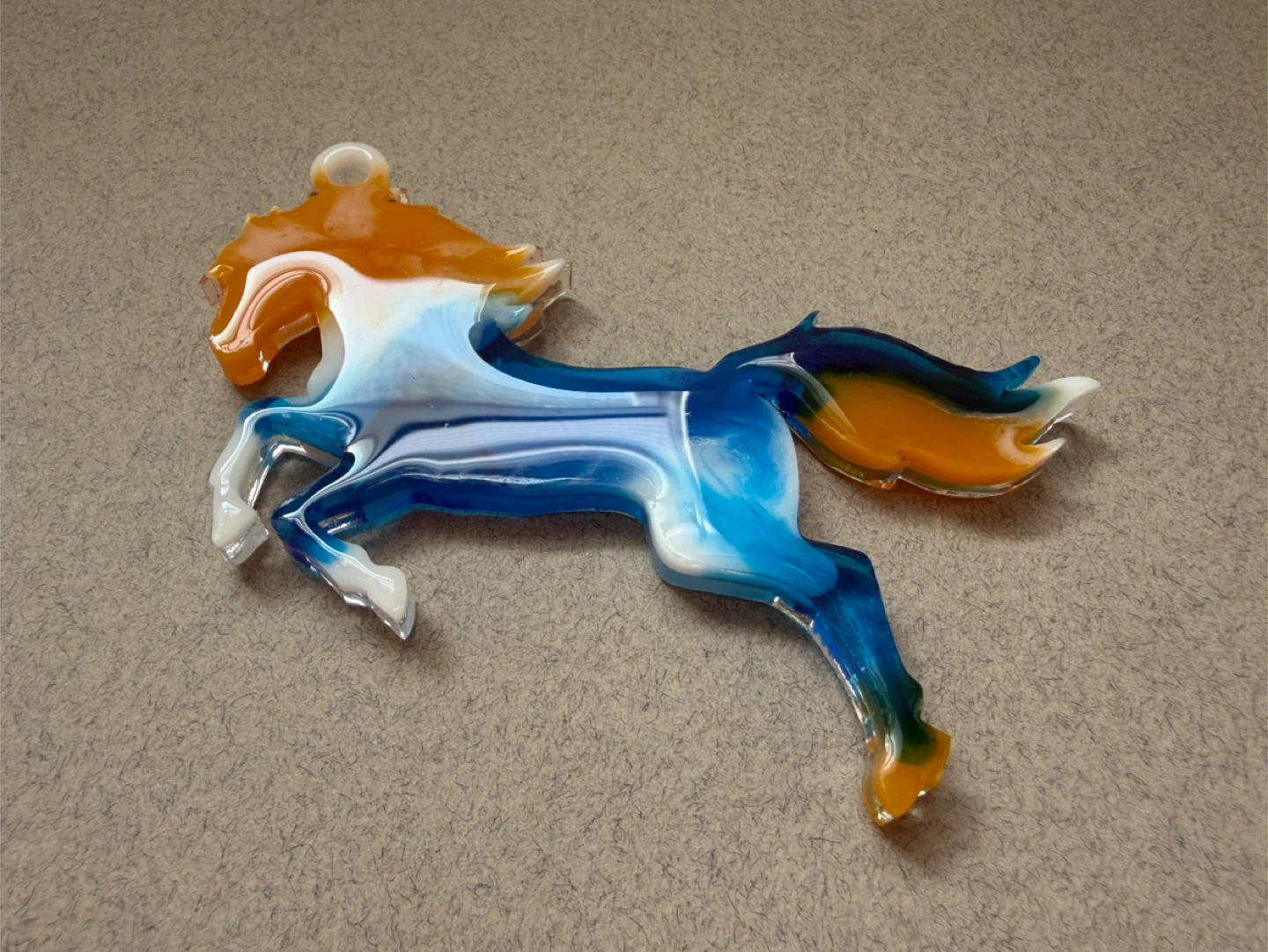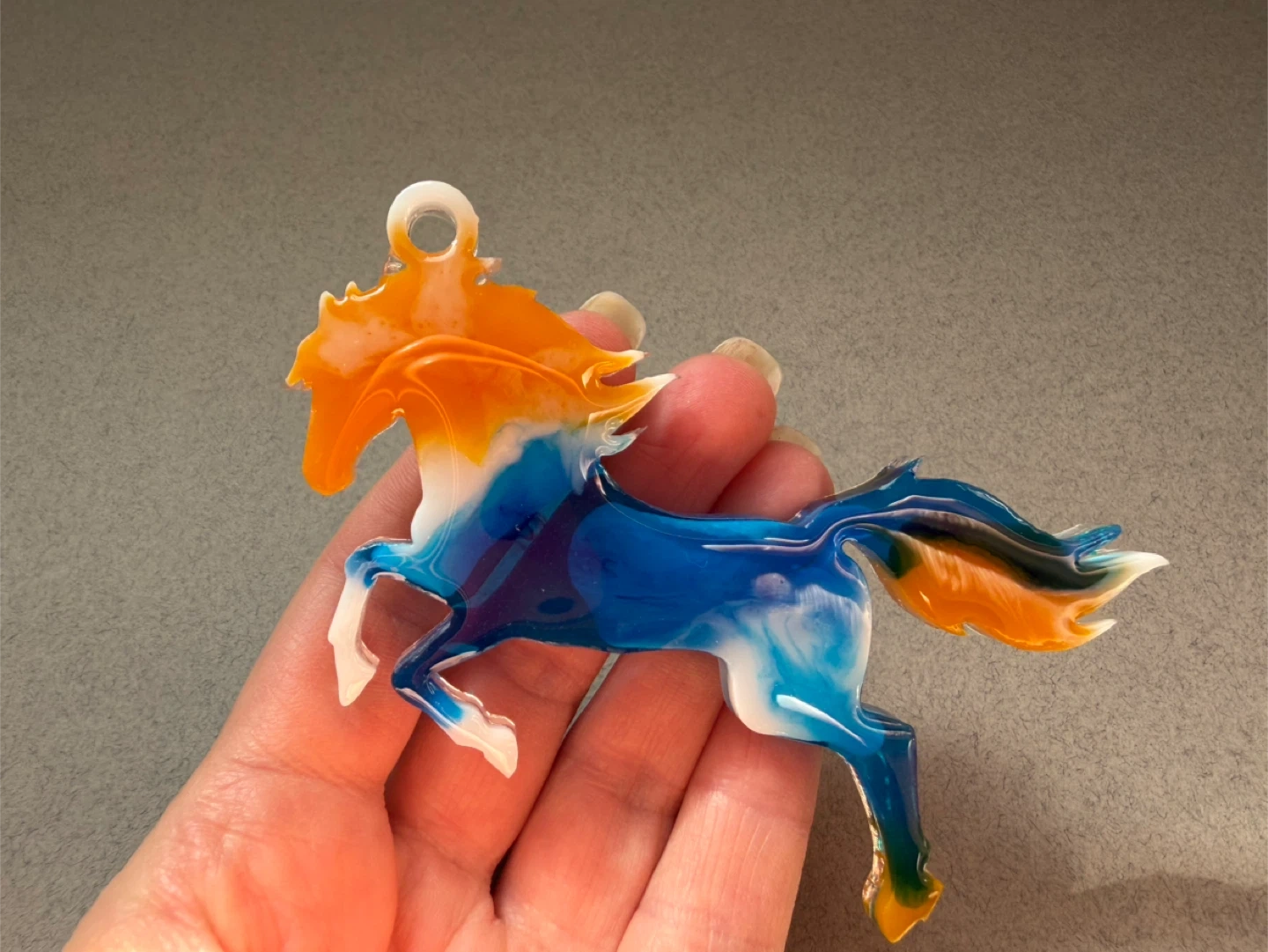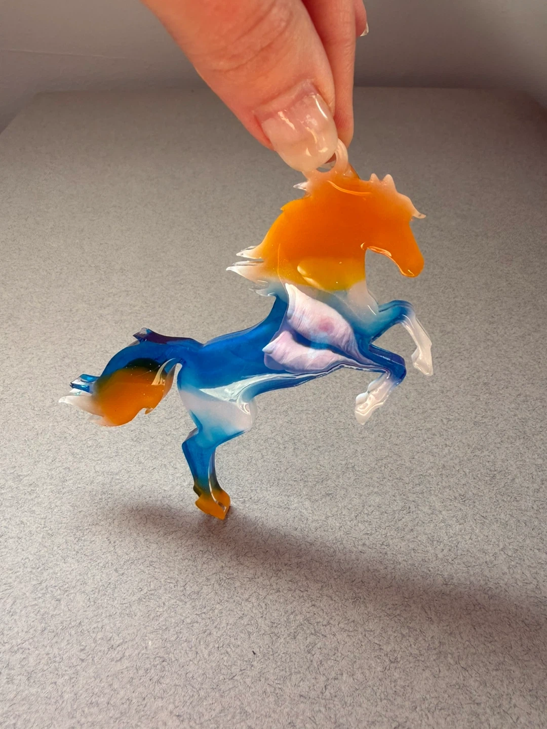 Handmade resin mustang charm with a vibrant multicolor gradient and glossy finish.