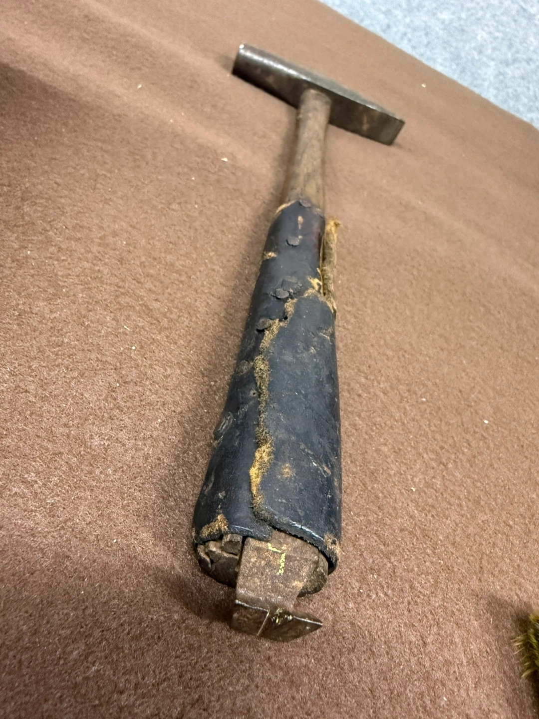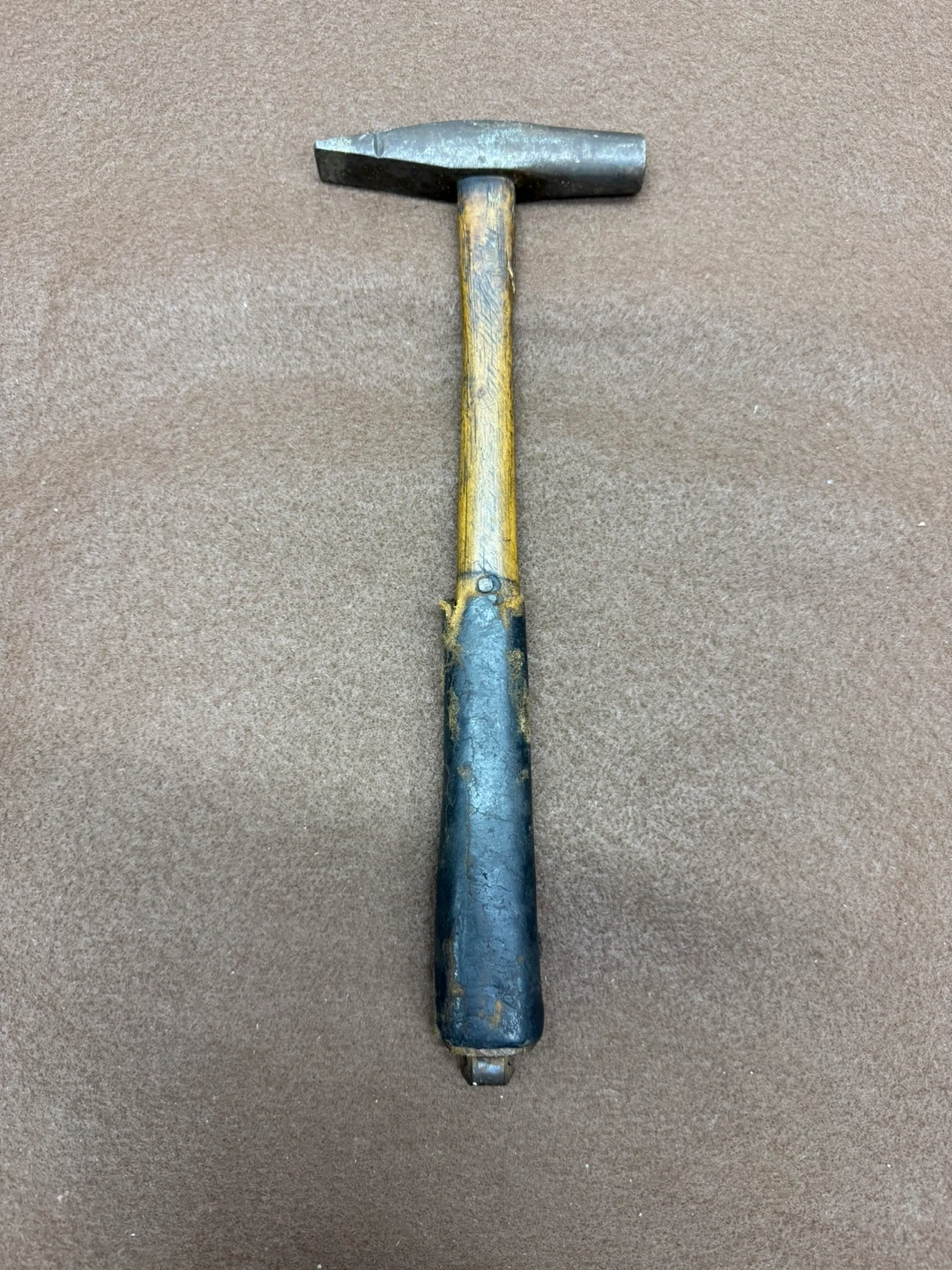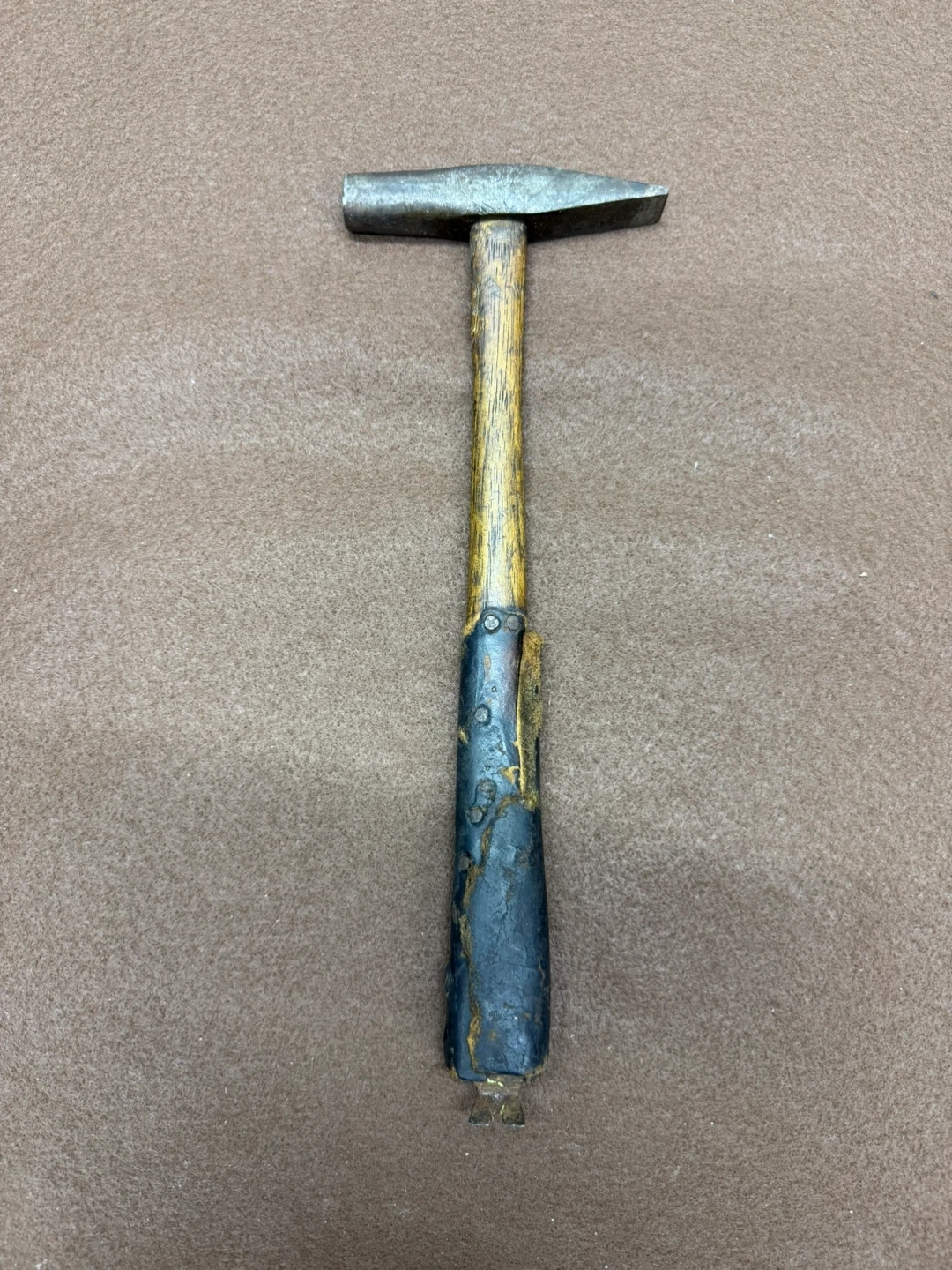 Please review photos for condition and details. This vintage cobbler's hammer features a sturdy wooden handle with a worn black leather grip. Its metal head is designed for shoe repair tasks. It's a unique tool for crafting or collecting!