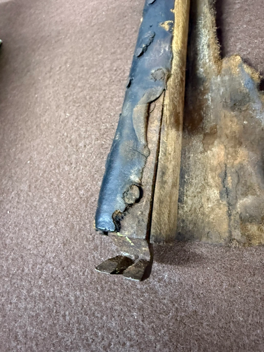 Shows age and workshop wear. Leather grip has wear from use. Solid vintage tool with good patina.