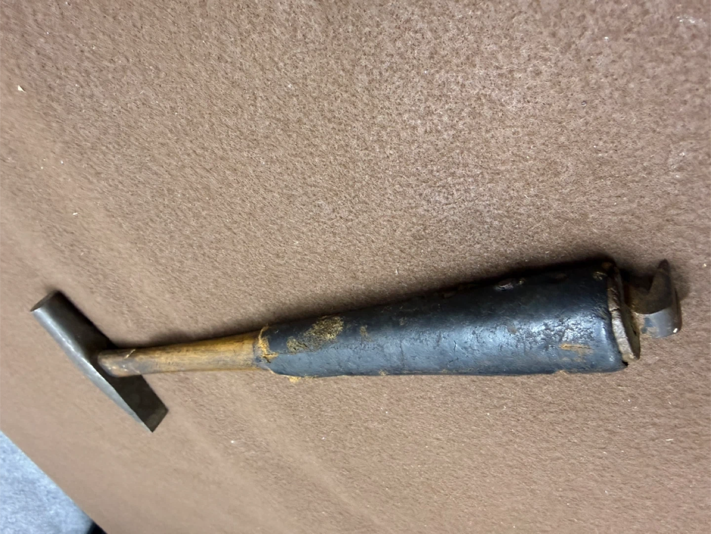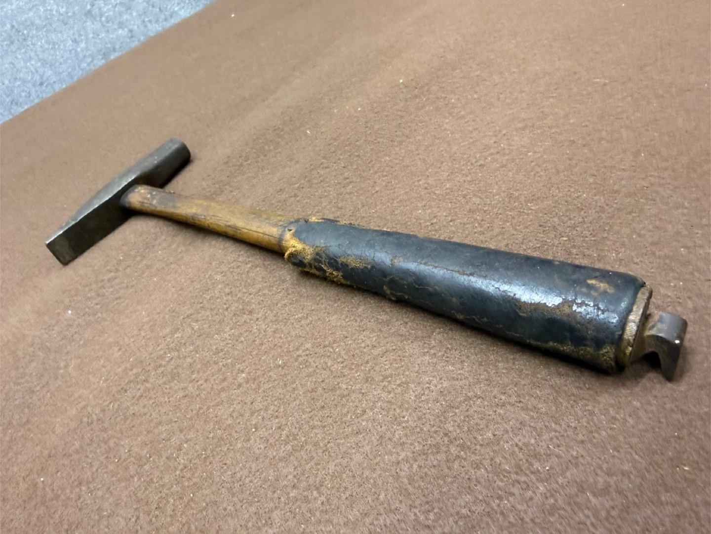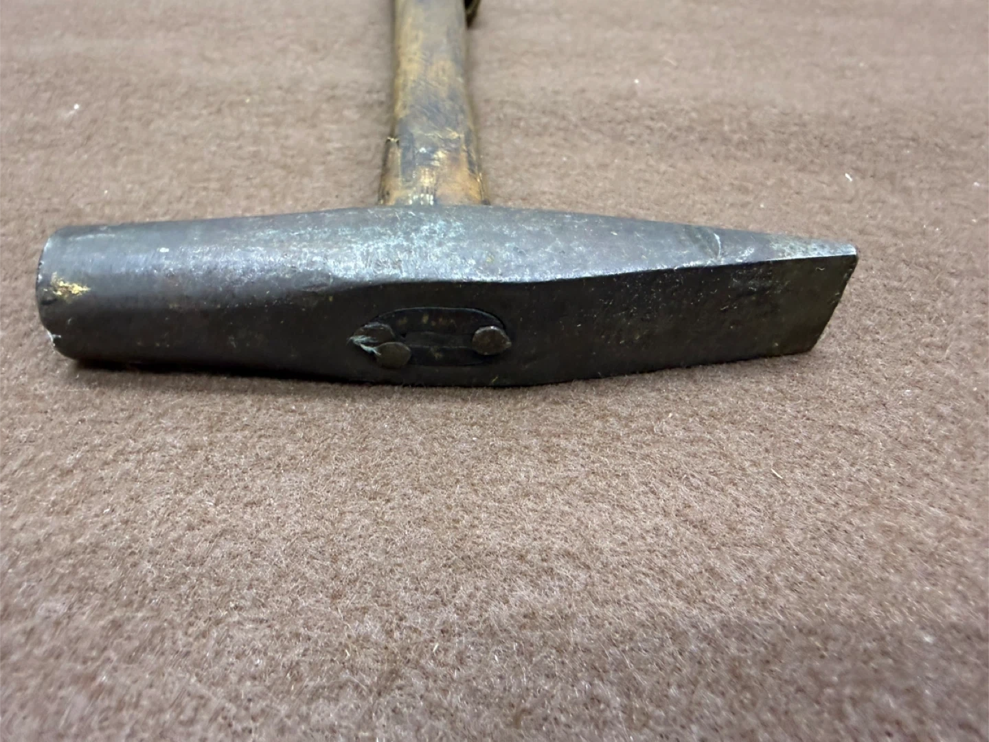 Vintage slate roofing hammer with forged steel head and wooden handle.