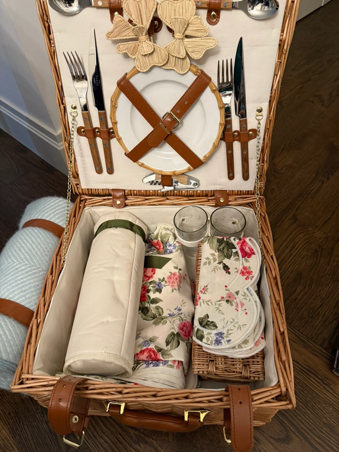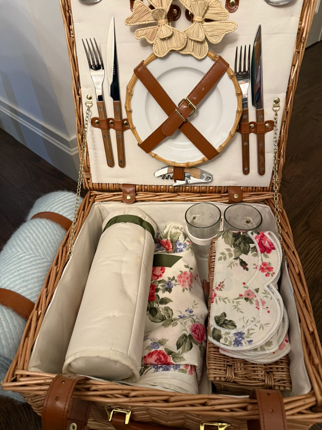 Includes a wicker basket, utensils, plates, and more. There is also a folded blanket to bring with you. This set is perfect for a relaxing afternoon out in nature.