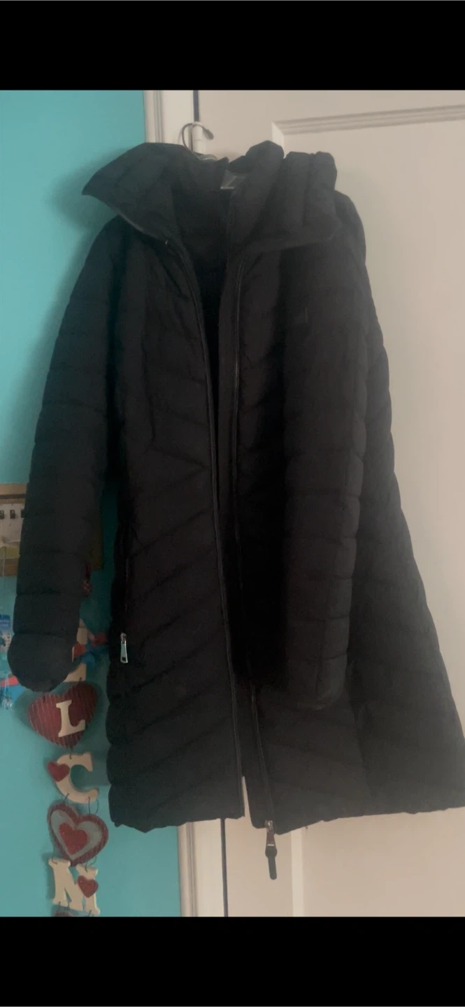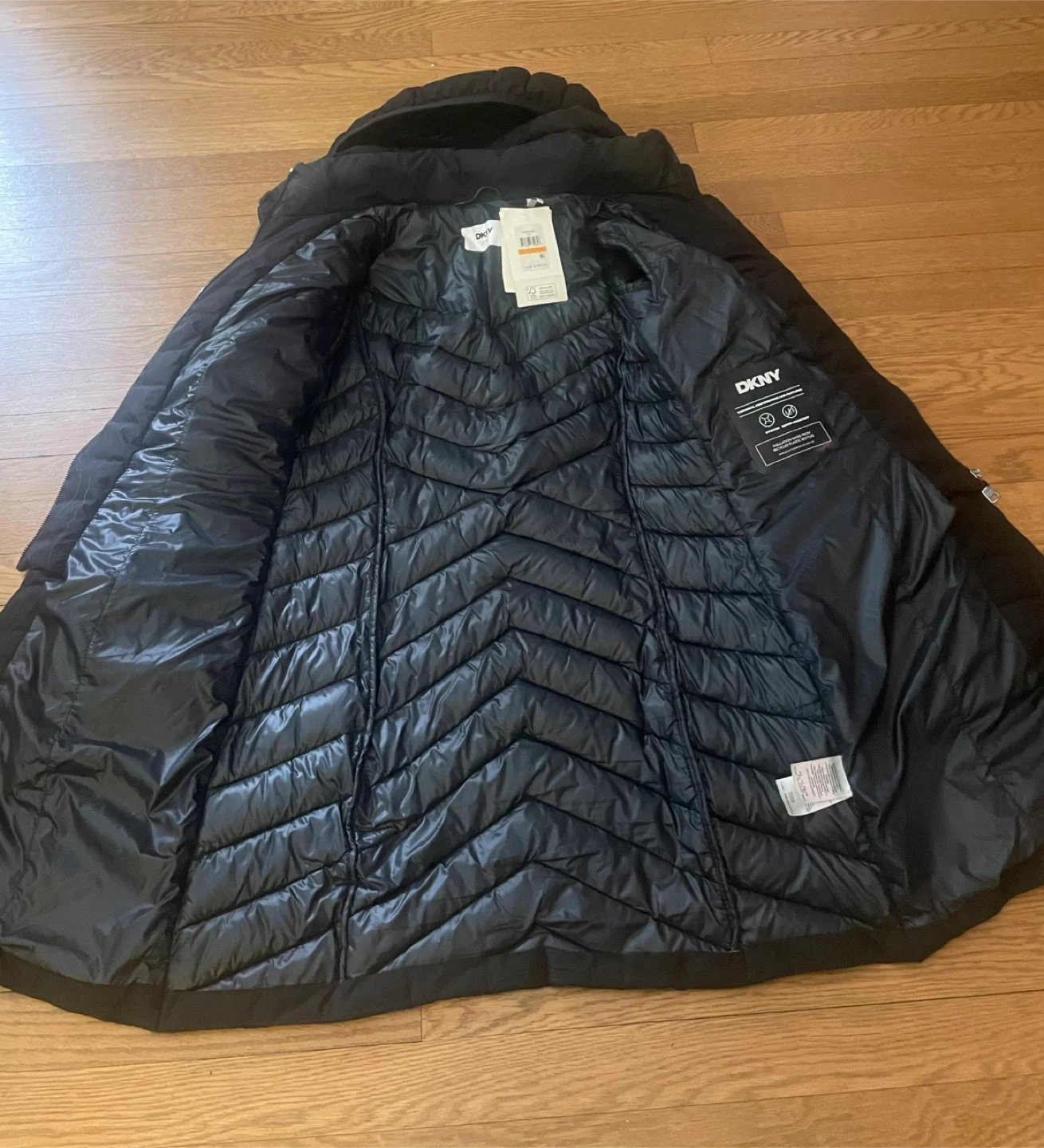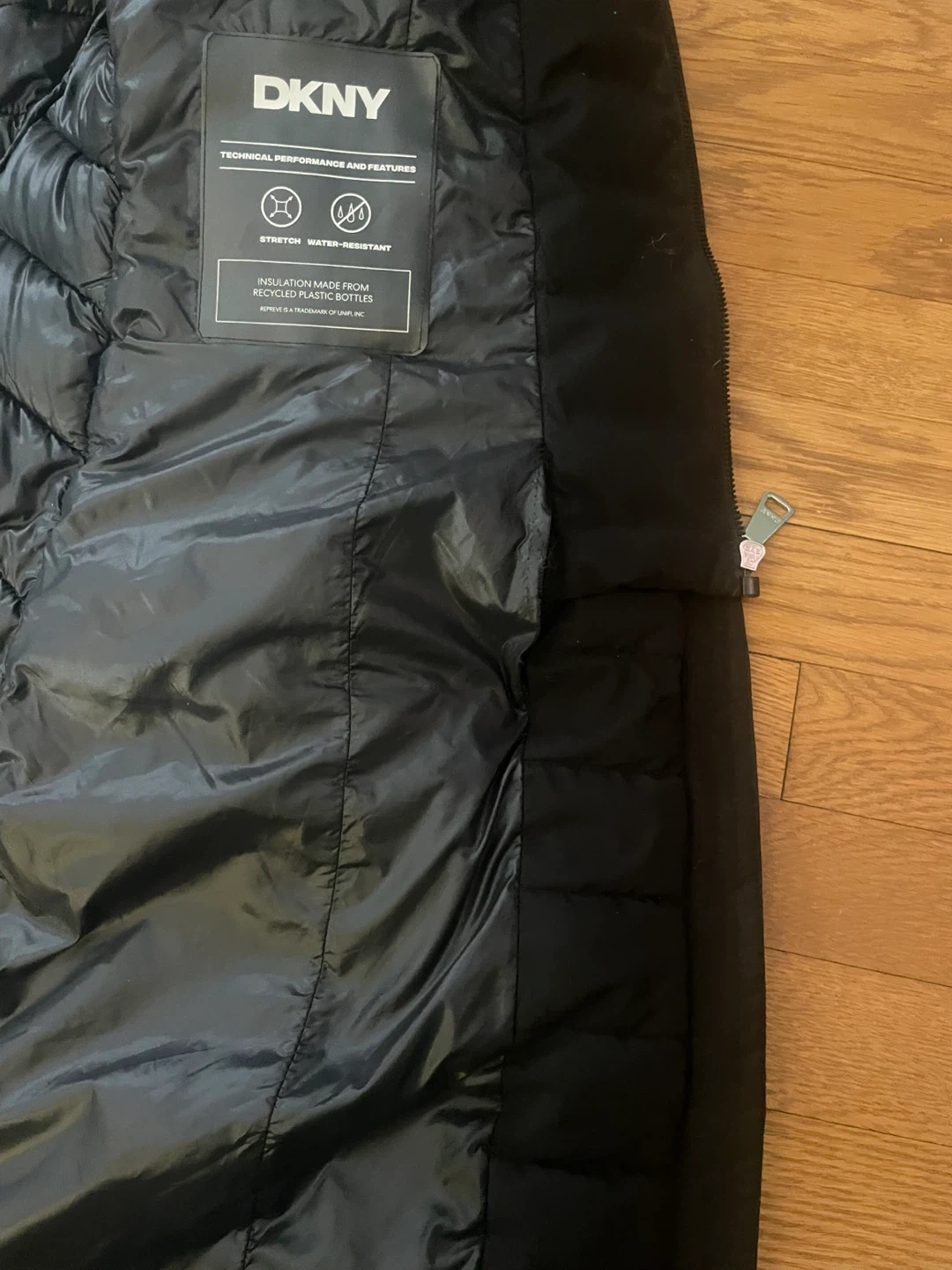 DKNY black puffer coat with a hood. Features stretch and water-resistant material. Insulation is made from recycled plastic bottles. It's a great coat for cooler weather!