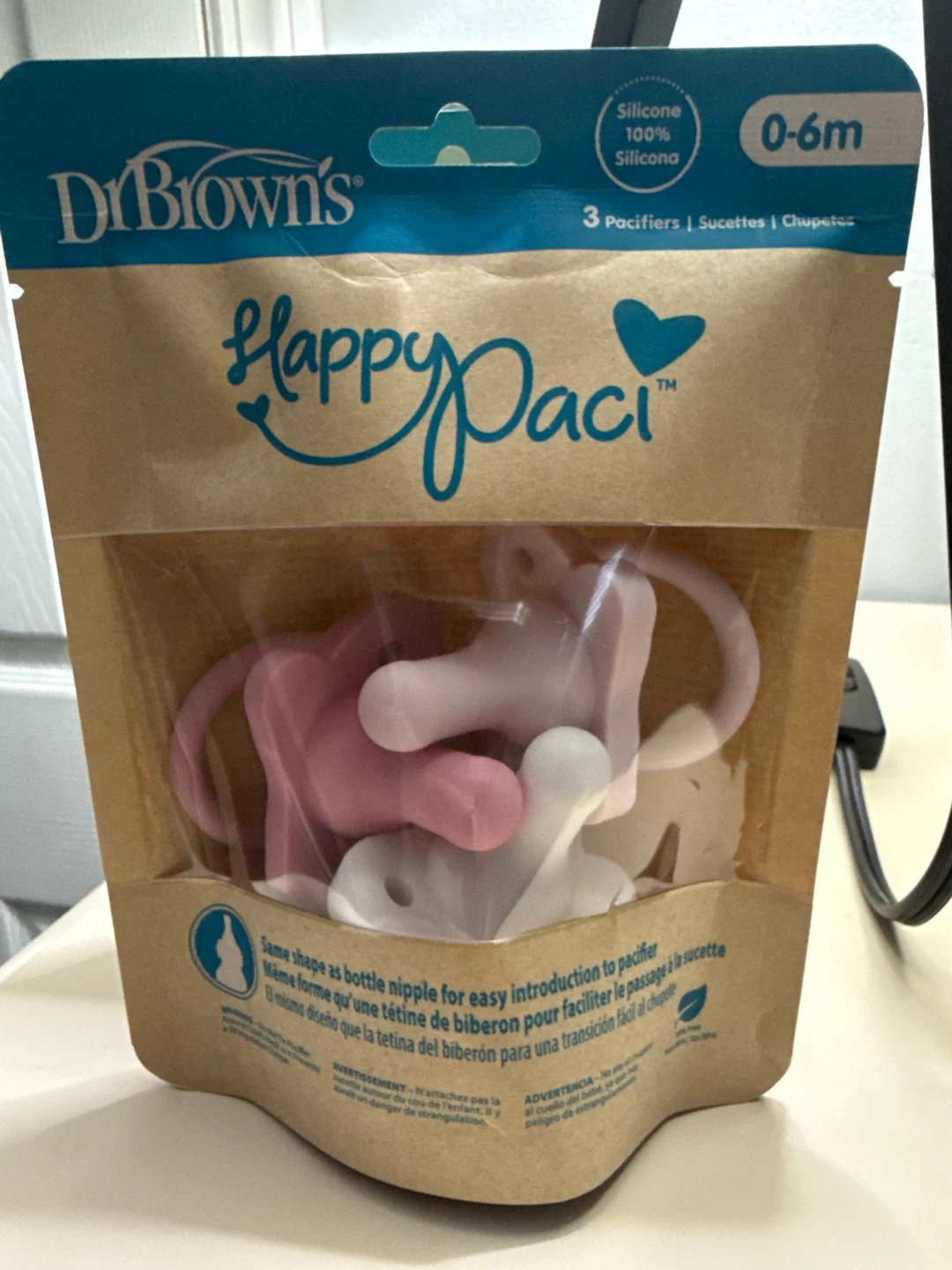 I'm selling a pack of Dr. Brown's Happy Paci pacifiers. They're designed for babies aged 0-6 months and are made of 100% silicone. They come in a pack of three and are designed to have the same shape as a bottle nipple for easy transition to a pacifier