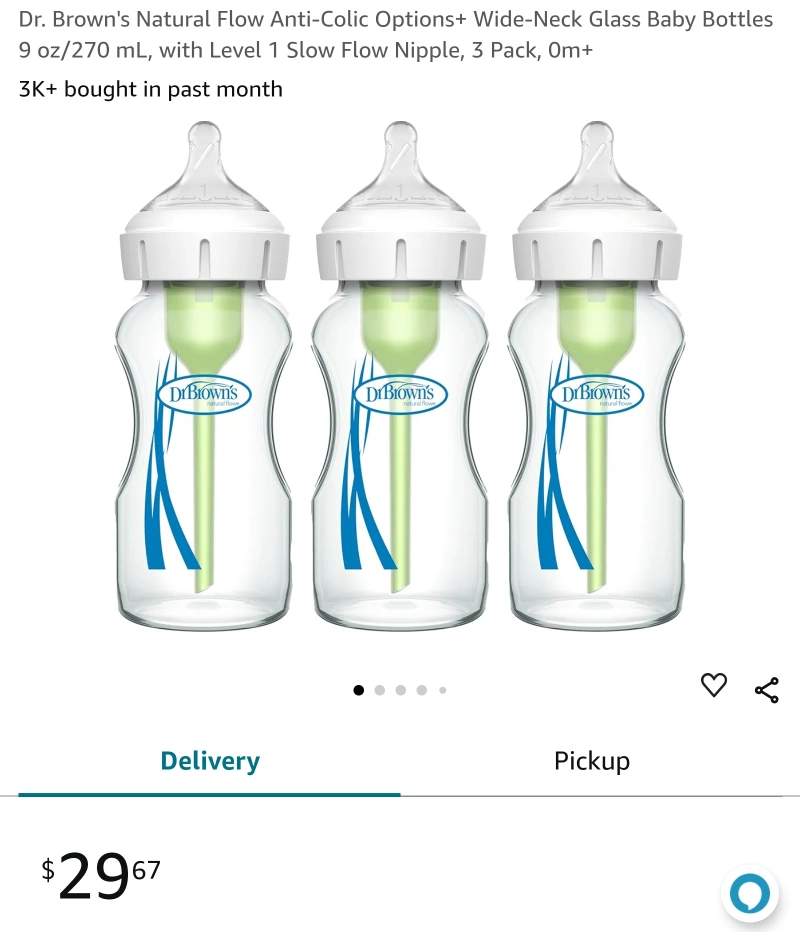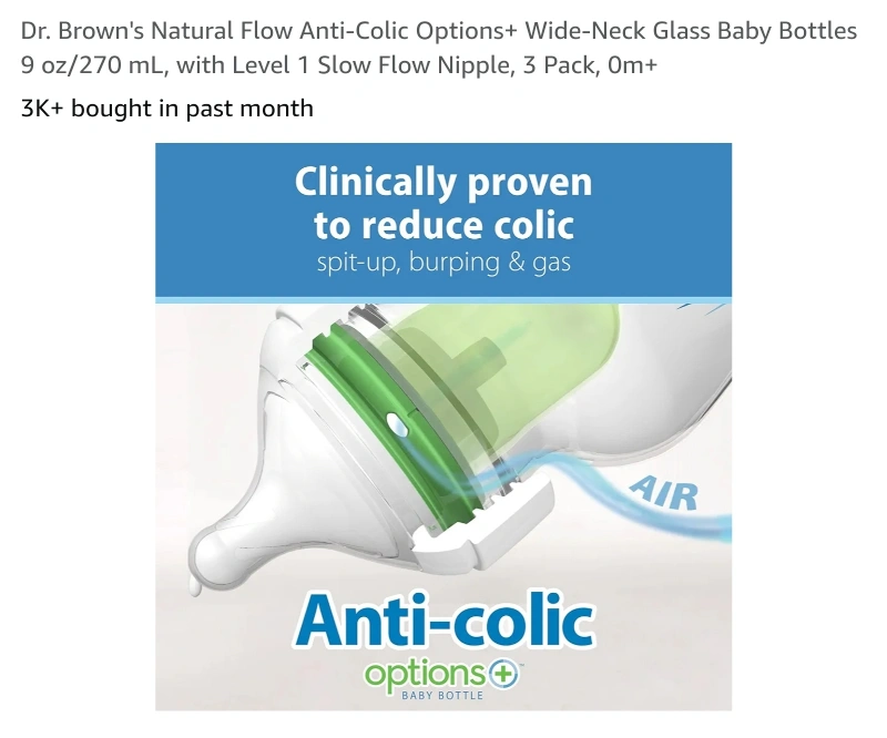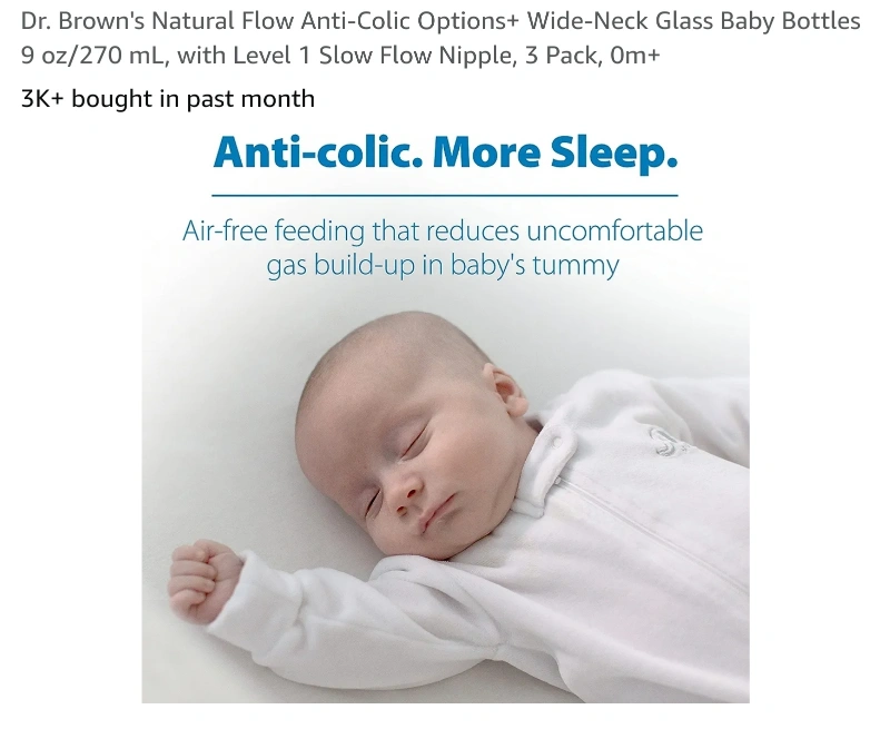 17Dr. Brown's Baby Bottles 3 Pack, 9oz BPA Free Wide-Neck Nipple ANTI-COLIC GLASS BABY BOTTLE. Anti-Colic internal vent system is clinically proven to reduce colic. Decreases spit-up, burping and gas. CONSISTENT FLOW RATE. Vacuum-free feeding is closest to breastfeeding and Dr. Brown’s silicone nipples provide a consistent flow so babies can feed at their own pace. PRESERVES NUTRIENTS. The anti-colic vent system is proven to help preserve bottle milk nutrients and aids in digestion for a better night’s sleep. BREASTFEEDING BOTTLE. The breast-like nipple shape encourages a proper latch for a more natural bottle feeding experience and eases the transition from breast to bottle and back again. BOTTLE GROWS WITH BABY. Dr. Brown’s Natural Flow Anti-Colic Options+ baby bottle works best with the internal vent system in place but can be removed as baby’s feeding develops – no need to introduce a different bottle. SUSTAINABLE BABY BOTTLE. Dr. Brown’s Wide-Neck bottle is designed to nourish through all of baby’s feeding stages and is recyclable. DISHWASHER SAFE. Safe for use in dishwasher (top rack only), electric and microwave sterilizers or boiling water. BPA Free. Dr. Brown’s Natural Flow Anti-Colic Options+ Wide-Neck Glass Baby Bottle 9 oz/270 mL, with Level 1 Slow Flow Nipple, 3 Pack, 0m+