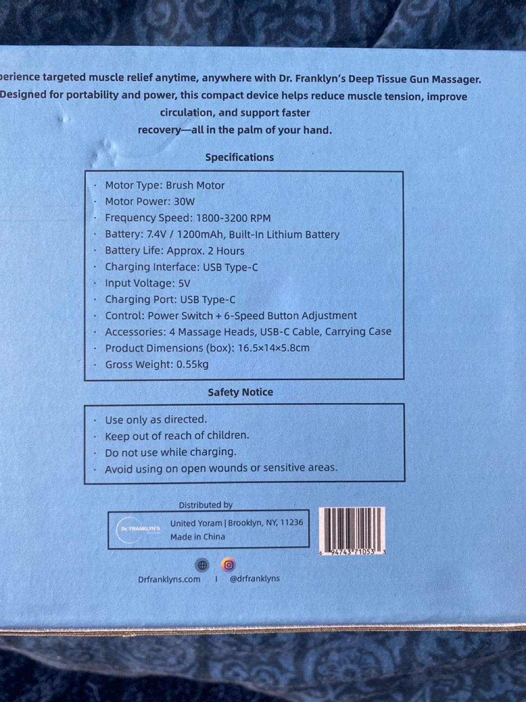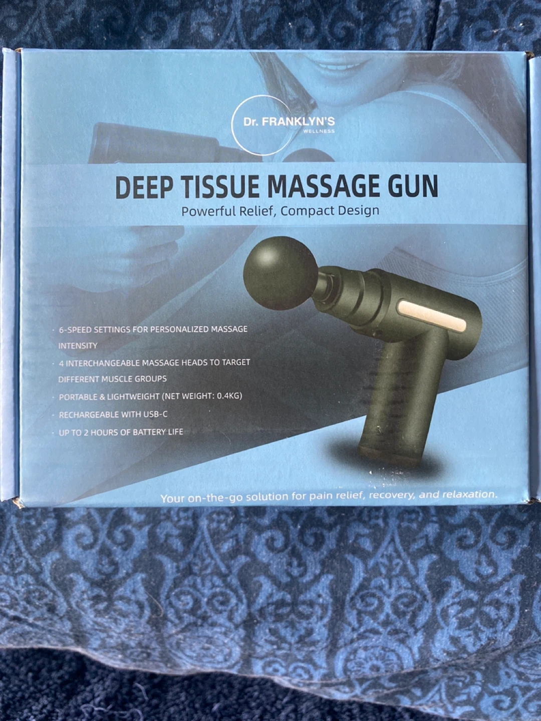 Get targeted muscle relief with Dr. Franklyn's Deep Tissue Massage Gun! It's designed for portability and power, and this compact device helps reduce muscle tension, improve circulation, and support faster recovery. Key features: - 6-speed settings for personalized massage - 4 interchangeable massage heads to target different muscle groups - Portable & lightweight (net weight: 0.4kg) - Rechargeable with USB-C - Up to 2 hours of battery life It comes with 4 massage heads, a USB-C cable, and a carrying case