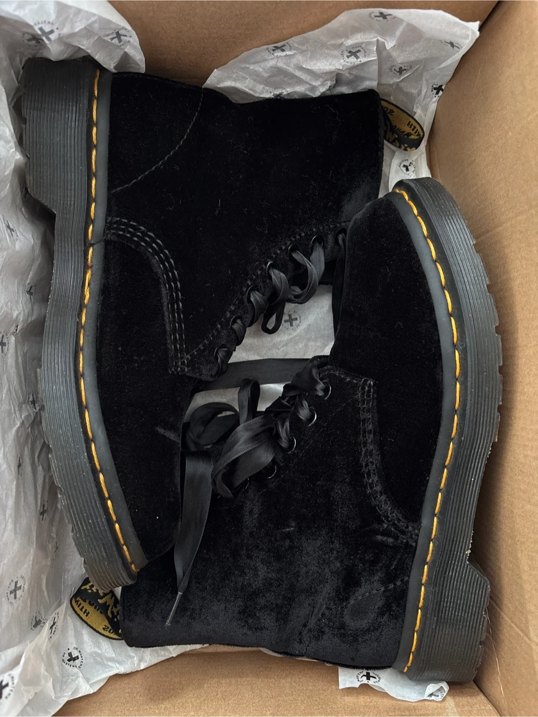 Dr. Martens 1460 boots in a beautiful black velvet material! These boots are in excellent condition and come with the original box. They feature the classic Dr. Martens yellow stitching.