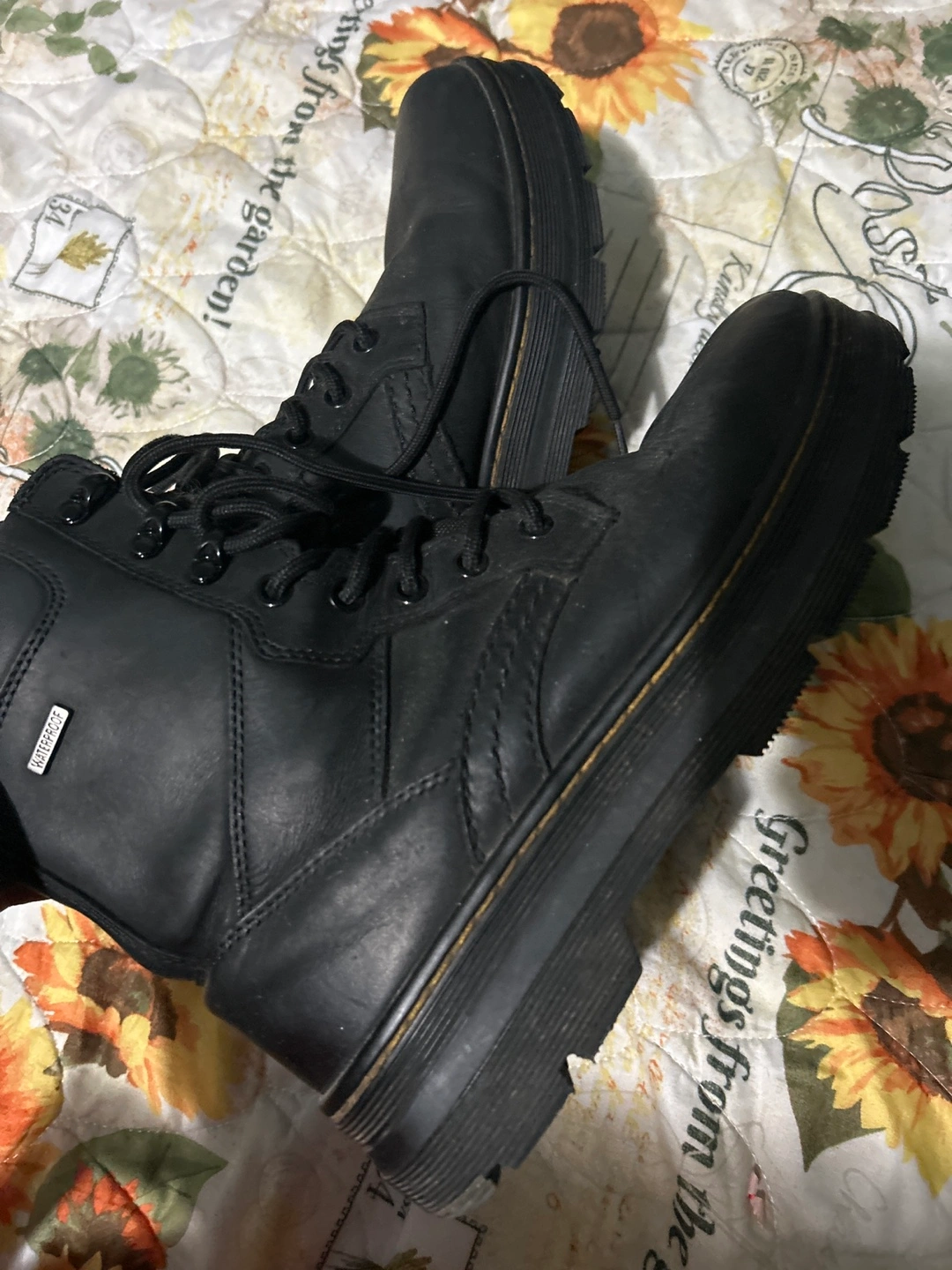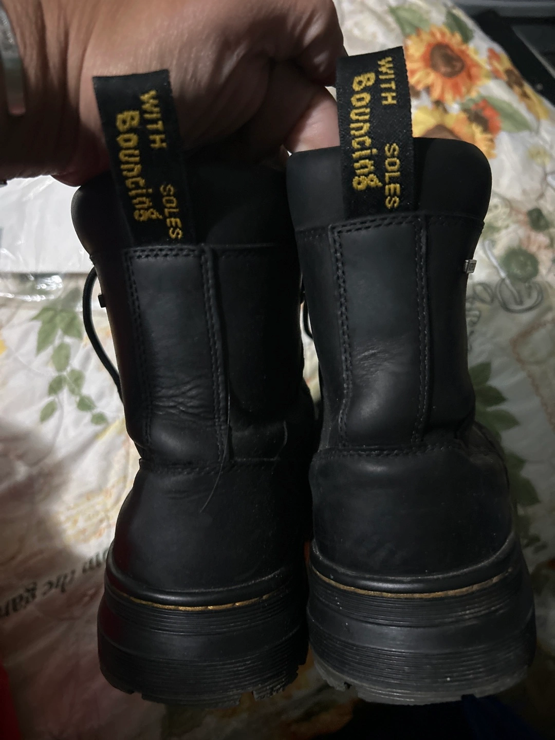 15Selling a pair of Dr. Martens boots in black leather. They have the classic "With Bouncing Soles" tag. The size is US 8. These boots show some signs of wear but are still in good condition for everyday use!