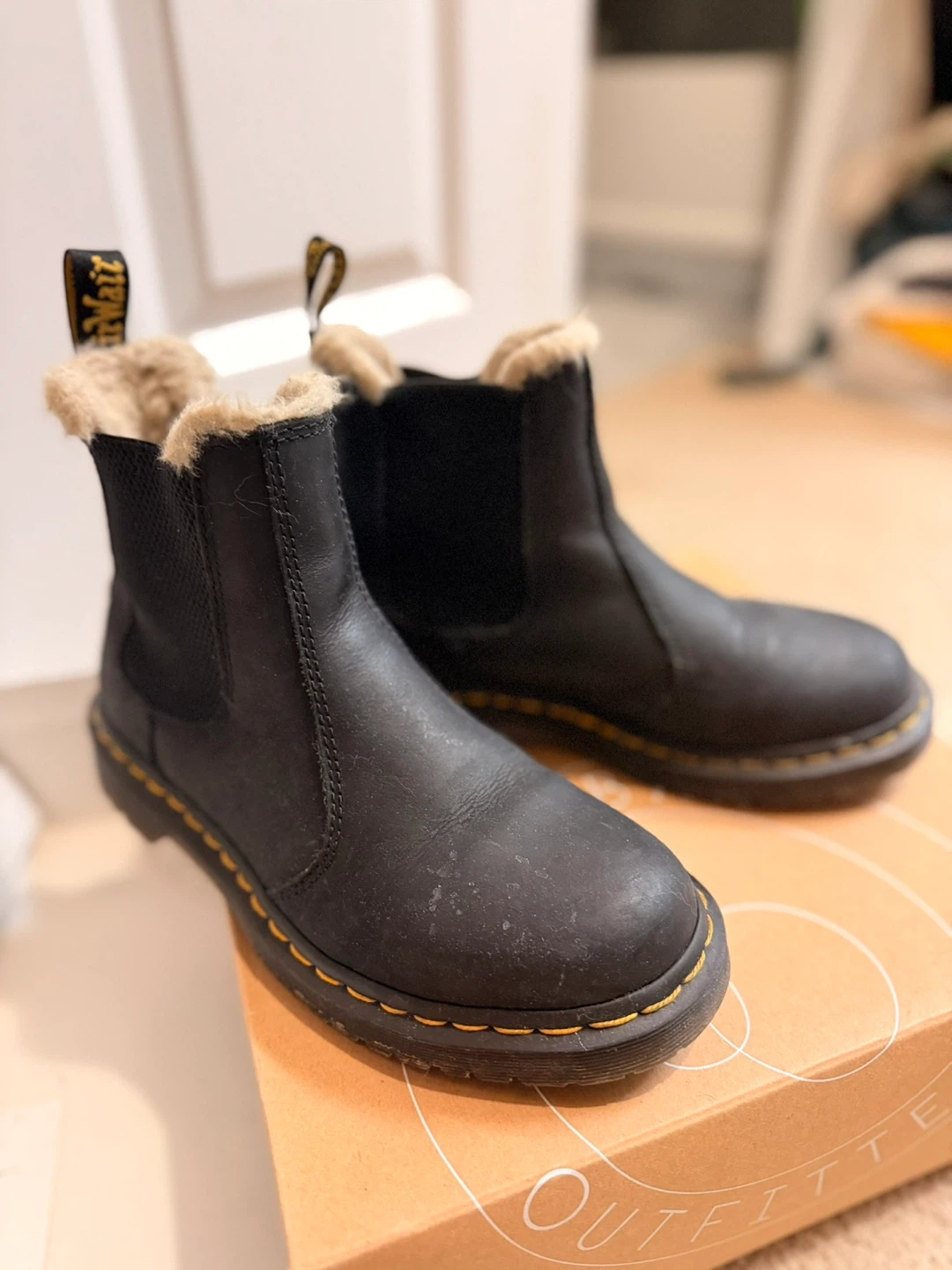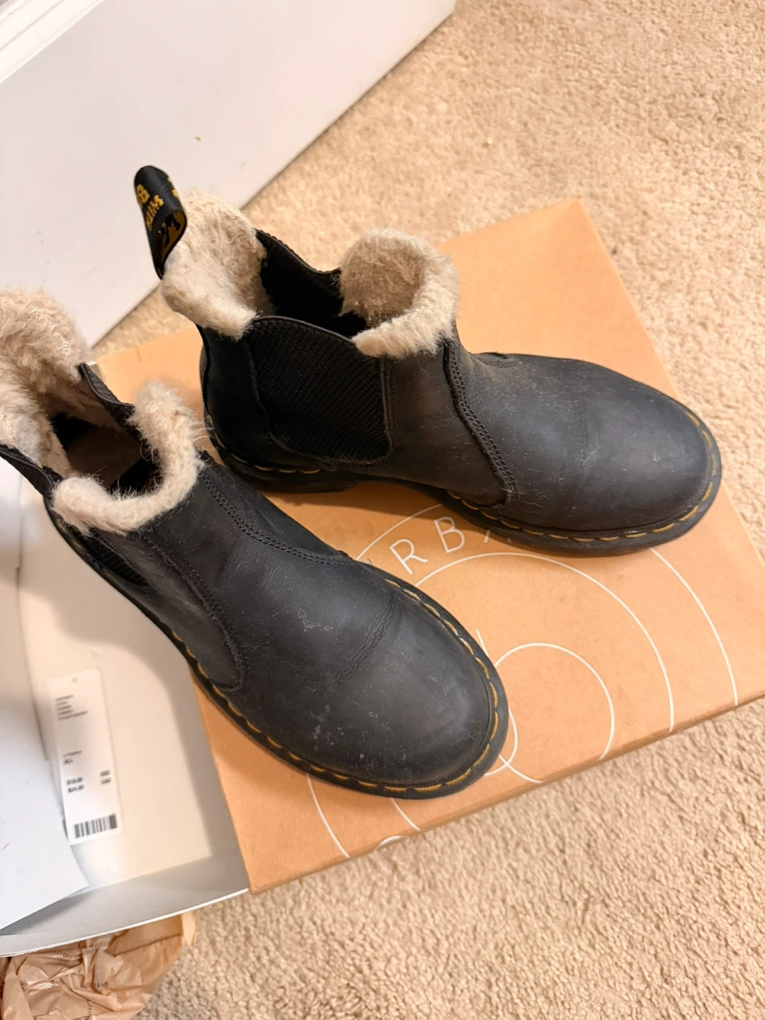 15Selling a pair of Dr. Martens Leona Chelsea boots! These are black and feature a faux fur lining. They are a US size 7. The boots are in good condition and come with the original box