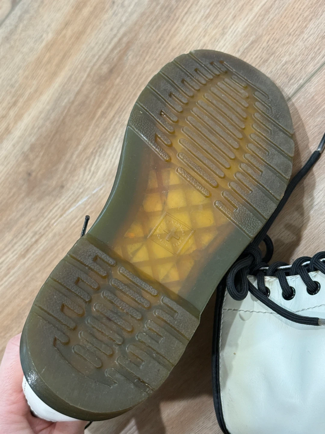 65Selling a pair of Dr. Martens boots in white leather. They have black laces and the classic Dr. Martens sole. These boots show some signs of wear, as you can see in the photos, but they're still ready for a new home! Kids size US 2