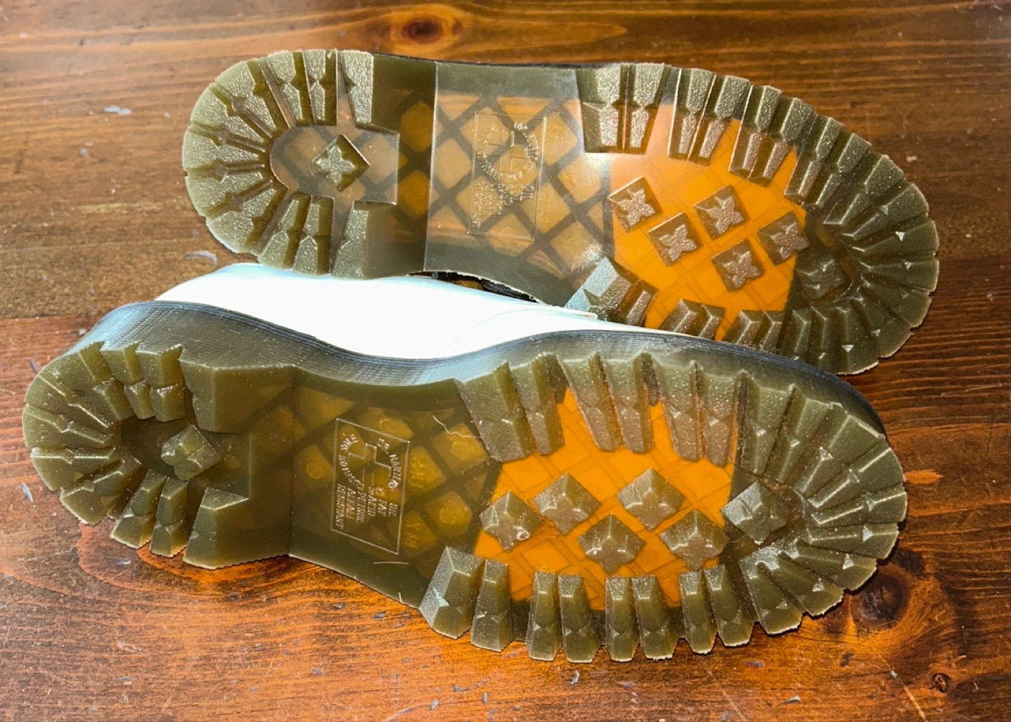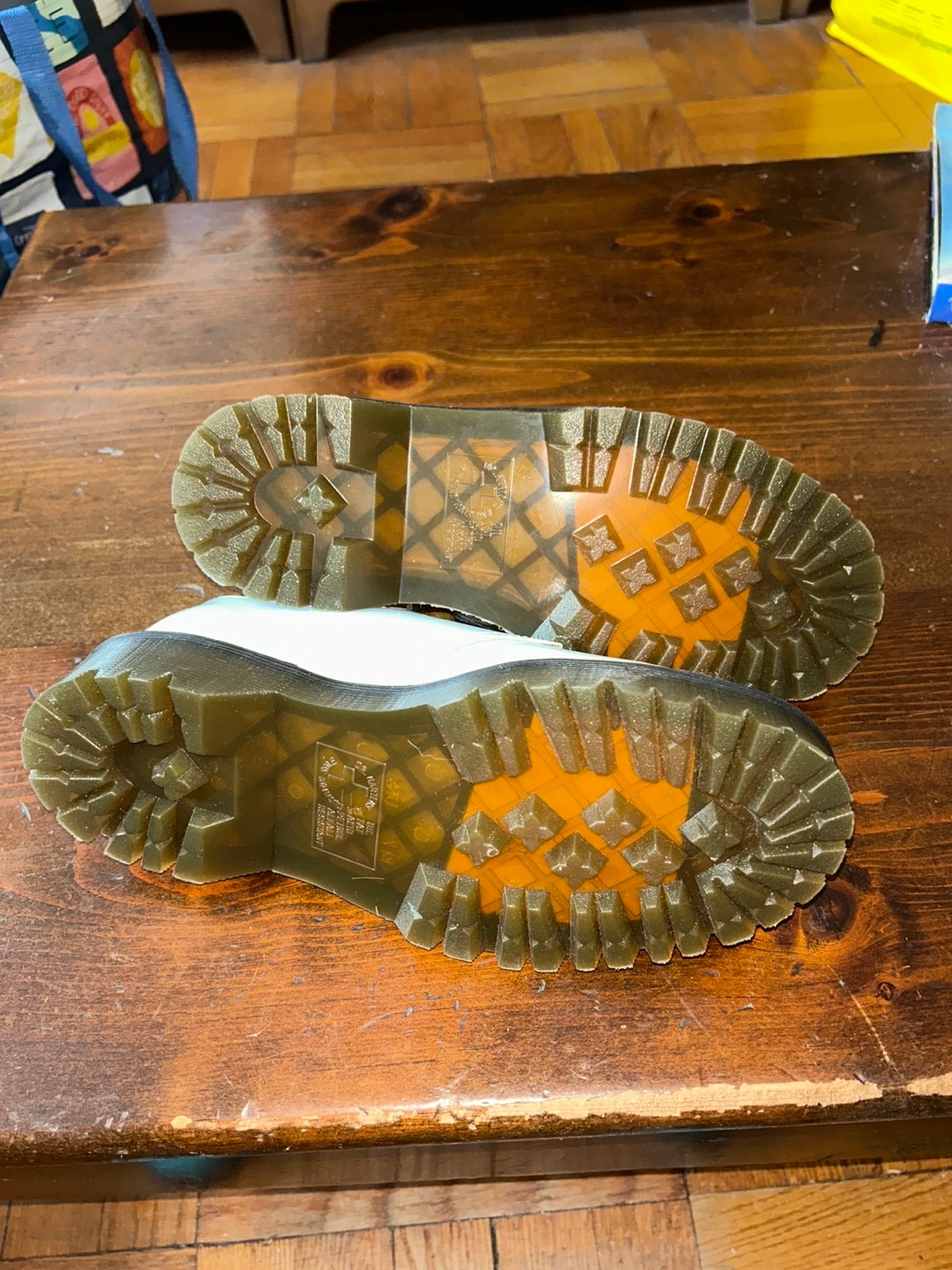 Dr. Martens White patent leather shoes with chunky platform sole. Black laces and yellow stitching. New; never worn. Women’s size 8. Originally sold for $150.