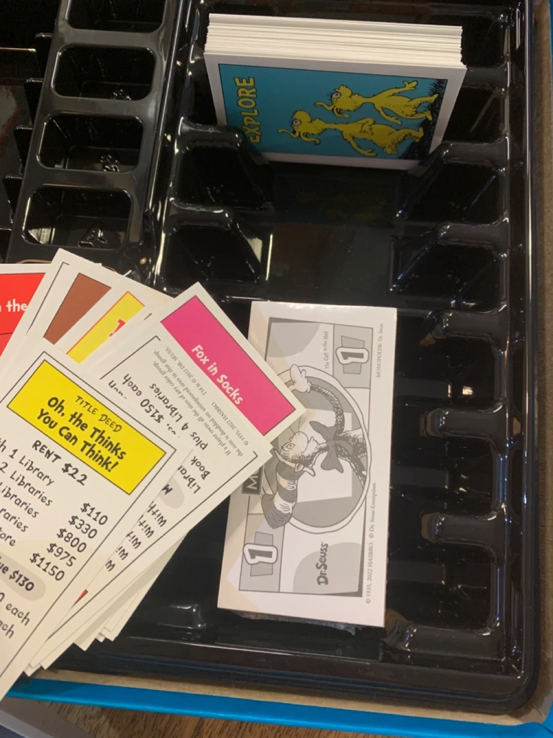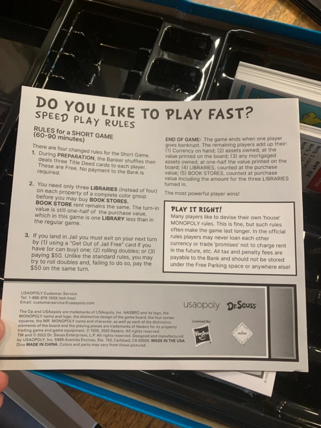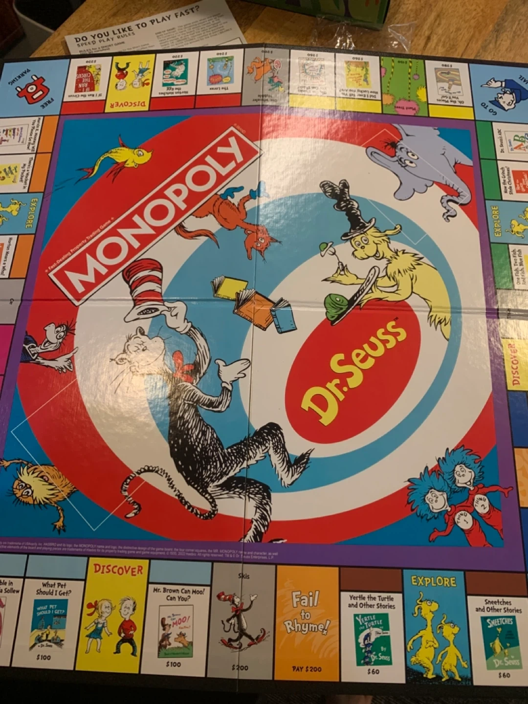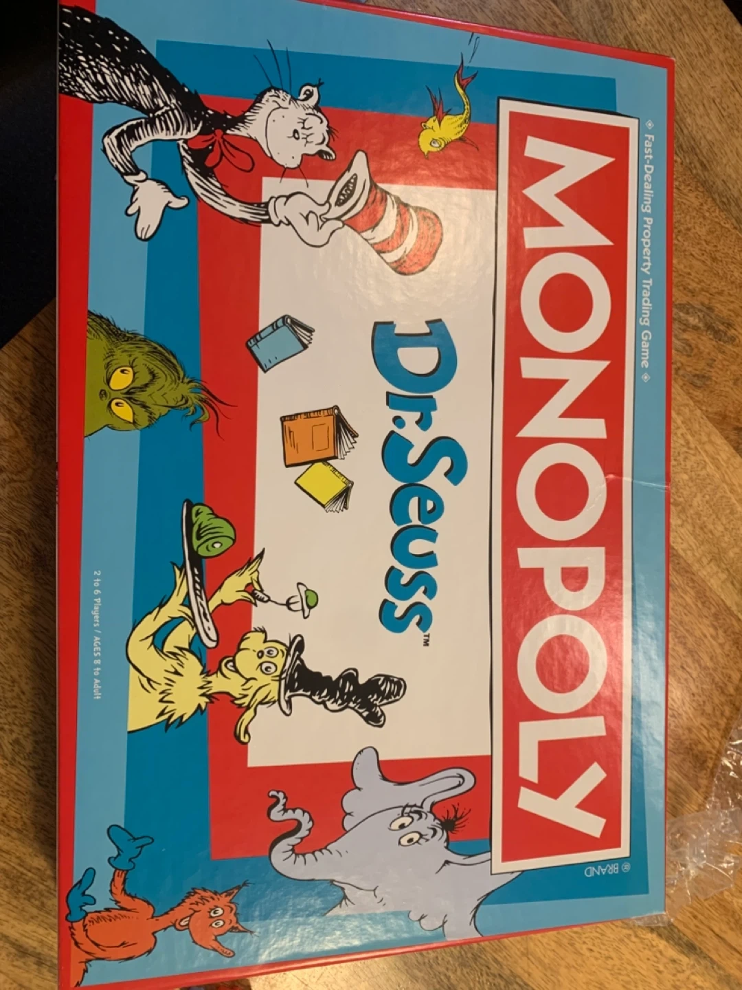 15Selling a Dr. Seuss Monopoly board game! It's a fun twist on the classic game with all your favorite Dr. Seuss characters. Perfect for family game night or a gift for a Dr. Seuss fan- cards are in great shape. 4 metal game figures included, everything else is shown.