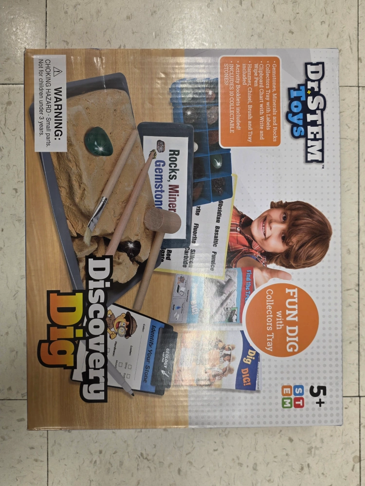 10Fun dig with collectors tray! This Dr. STEM Toys Discovery Dig kit includes gemstones, minerals, and rocks, a collector's tray with labels, a clipboard chart with a write and wipe pen, a hammer, chisel, brush, tray, and activity booklets. It also includes 10 collectable stones! Recommended for ages 5+