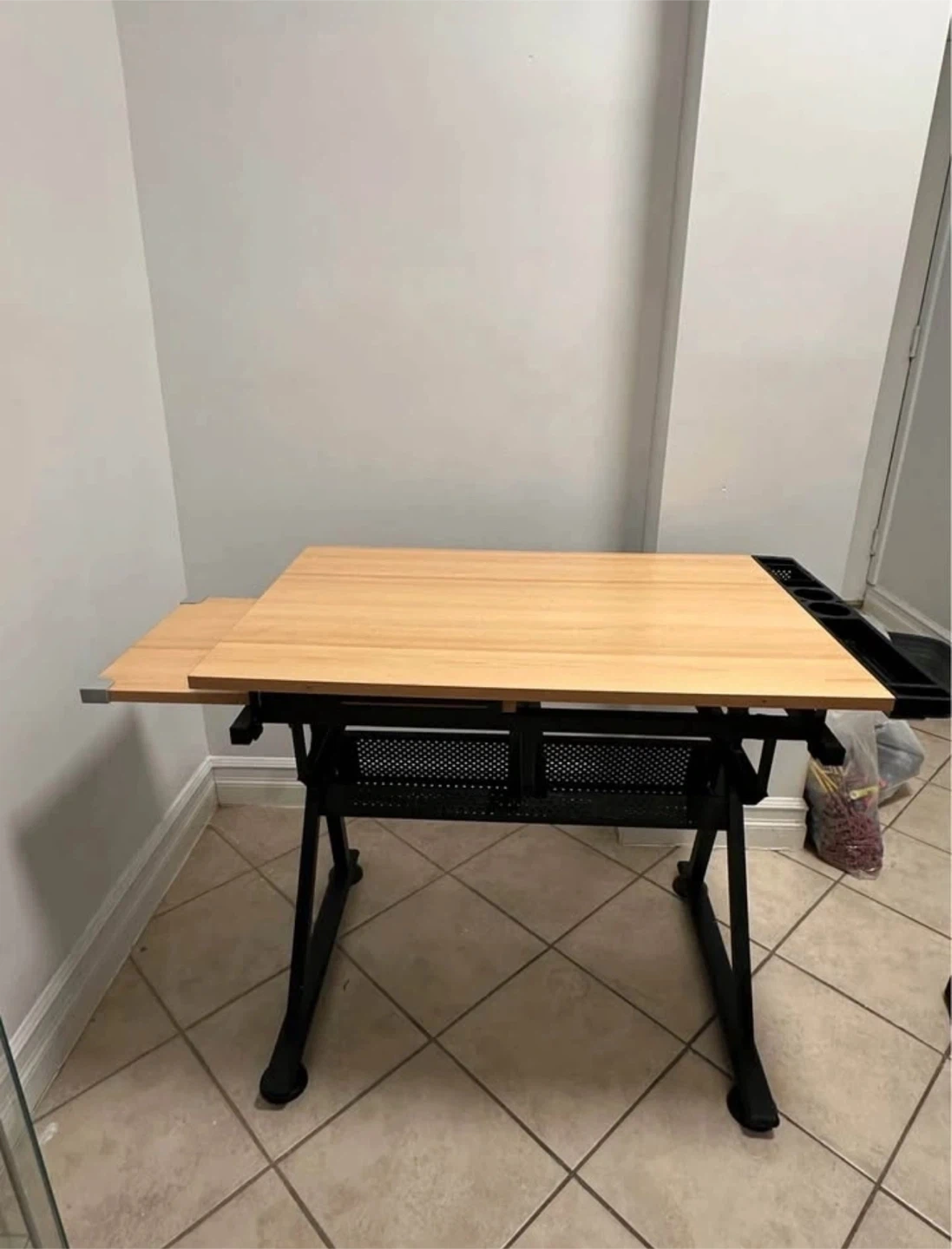 60Selling a drafting table with an adjustable height feature! The tabletop is light brown, and the frame is black. It's in great condition and ready for a new home. Perfect for artists, architects, or anyone who needs a versatile workspace
