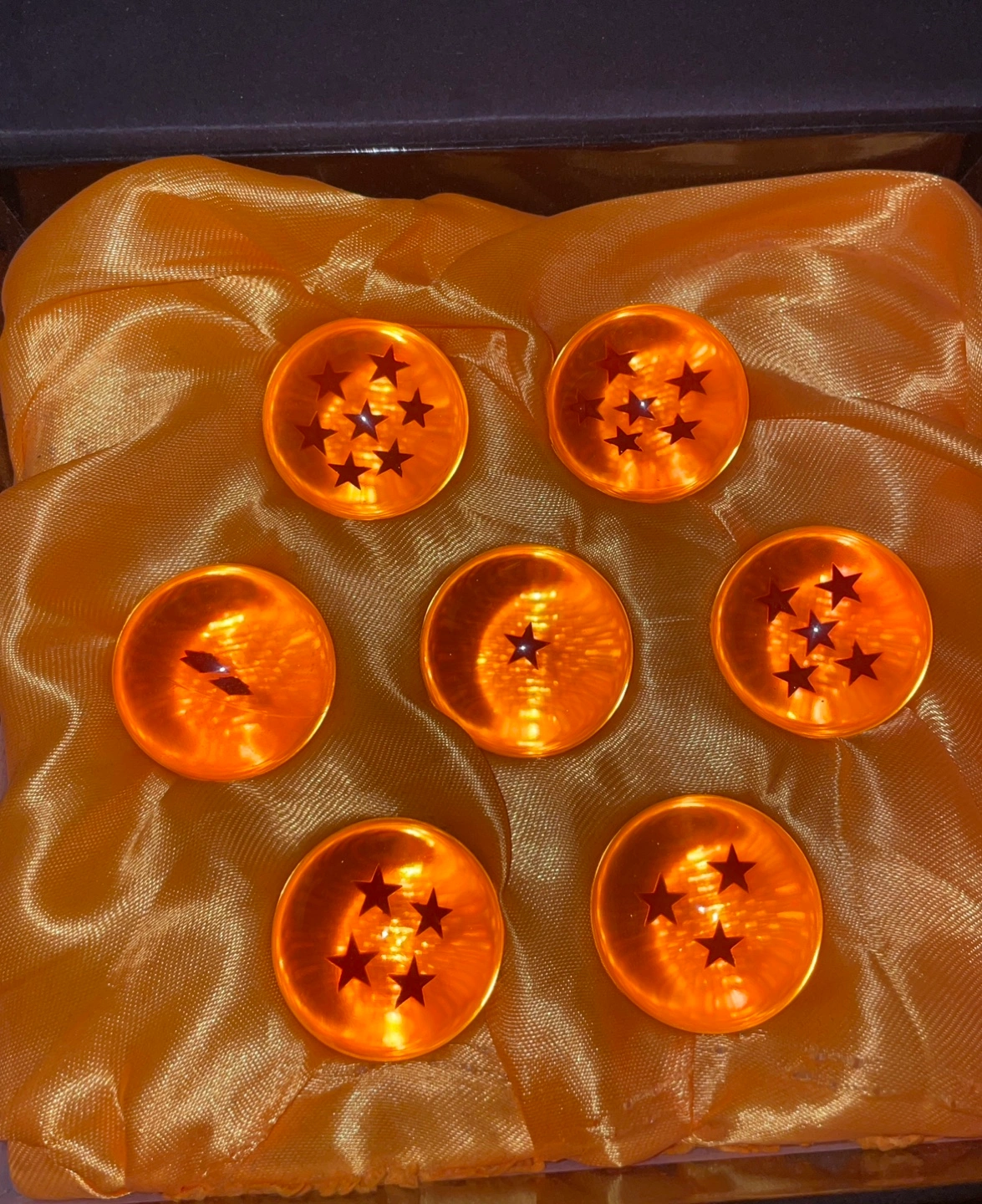 Seven orange Dragon Balls. Collectible set. Comes in a box with orange fabric interior.