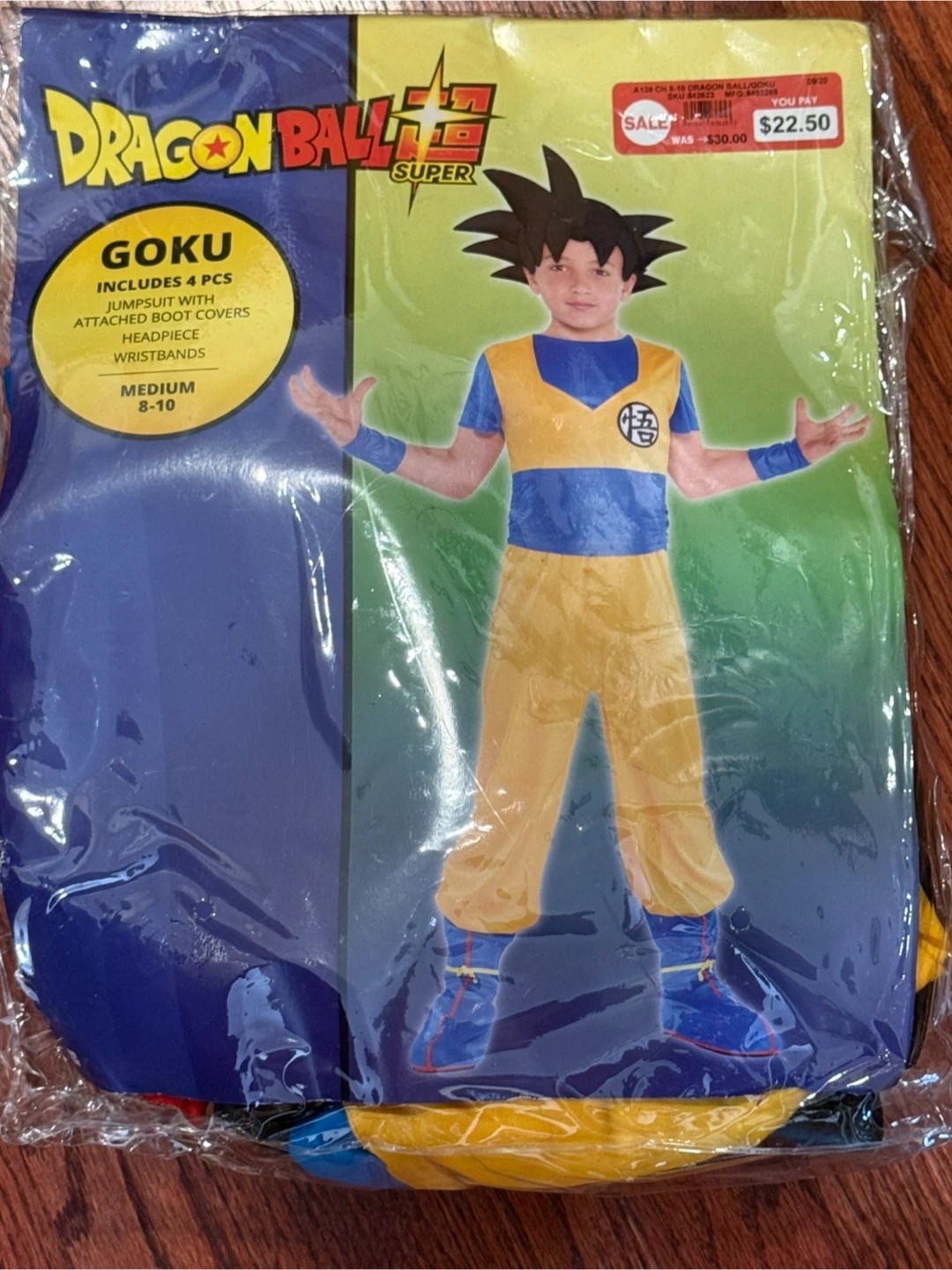 10Selling a brand new Dragon Ball Z Goku costume for kids! This is a size medium, suitable for ages 8-10. The costume includes 4 pieces: a jumpsuit with attached boot covers, a headpiece, and wristbands. Originally on sale for $22.50!