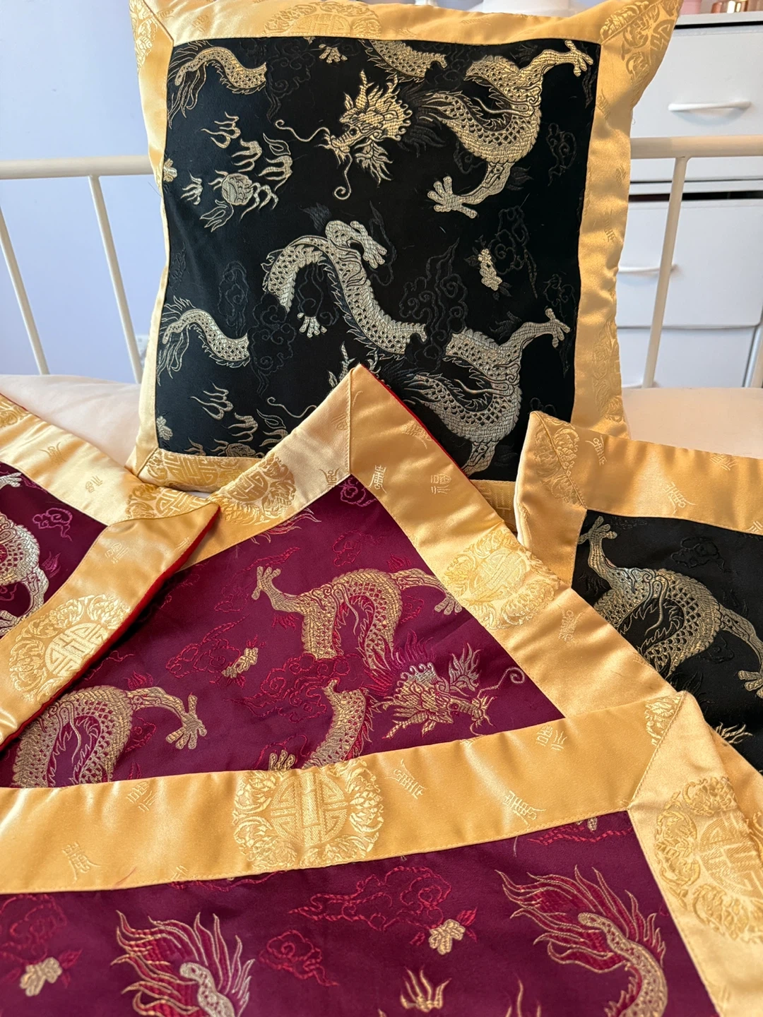Decorative pillows with a dragon design. One pillow is black and gold, and the others are burgundy and gold. One black pillow cover have broken zipper and other 4 is brand new!🥕
