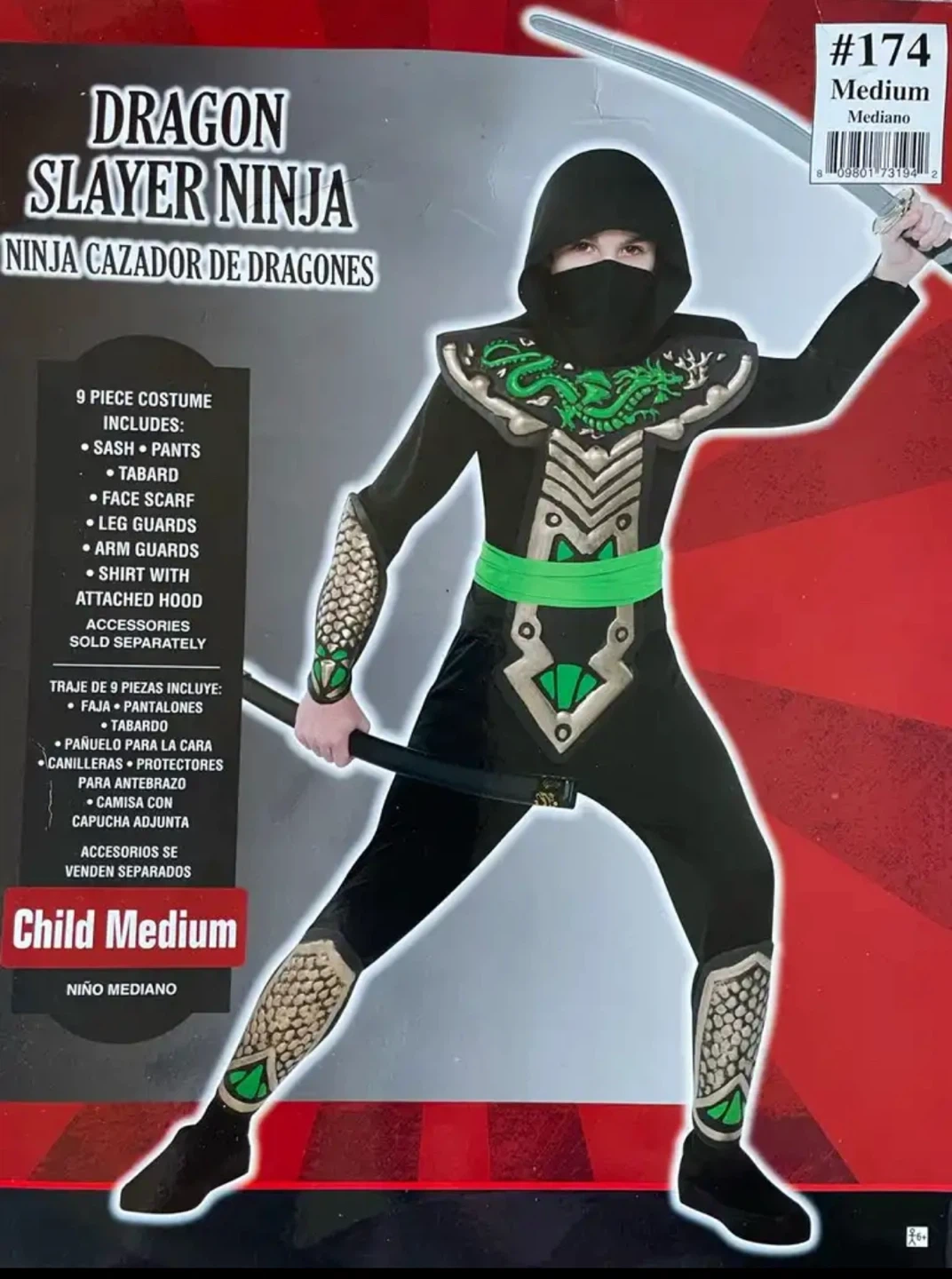 Selling a Dragon Slayer Ninja costume for kids! It's a child's size medium and includes 9 pieces: sash, pants, tabard, face scarf, leg guards, arm guards, and a shirt with an attached hood