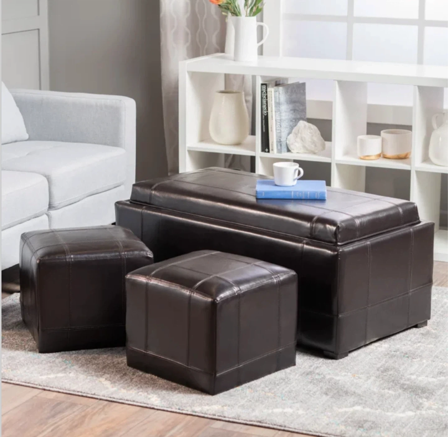 20The Drake 3-piece Bonded Leather Ottoman Set is a simple yet stylish storage ottoman and is an essential piece in any living room or den. The simplicity of the ottoman is only in its appearance; with ease, you can flip over the lid to reveal a wood serving tray, perfect for those quick meals or even to hold hors d'oeuvres at your next lavish party. As always with the finest ottomans, the Drake ottoman can be used as both storage and additional seating without taking away from the beauty of your decor. This large rectangular ottoman is crafted out of the finest bonded leather and is accented by decorative symmetrical stitching. To top off all these useful advantages of the Drake ottoman, two additional surprises await inside. The rectangular ottoman actually houses two smaller square ottomans. These two accompaniments match in style, material, and comfort so can either sit next to their larger counterpart or be used around the house for extra seating or feet-resting. Drake 3-piece Ottoman Set: Includes: 1 Large storage bench and 2 small ottomans Color: Brown Material: Bonded leather Provides plenty of storage space Additional seating with unmatched comfort Safety ventilation holes No assembly Large Storage Bench: Dimensions: 21.75” W x 41” D x 18.5” H Inside dimensions: 17” W x 36” D x 13.5” H Weight: 50 lbs Small Ottoman: Includes: 2 Dimensions: 15” W X 15” D x 13” H Weight: 15 lbs each