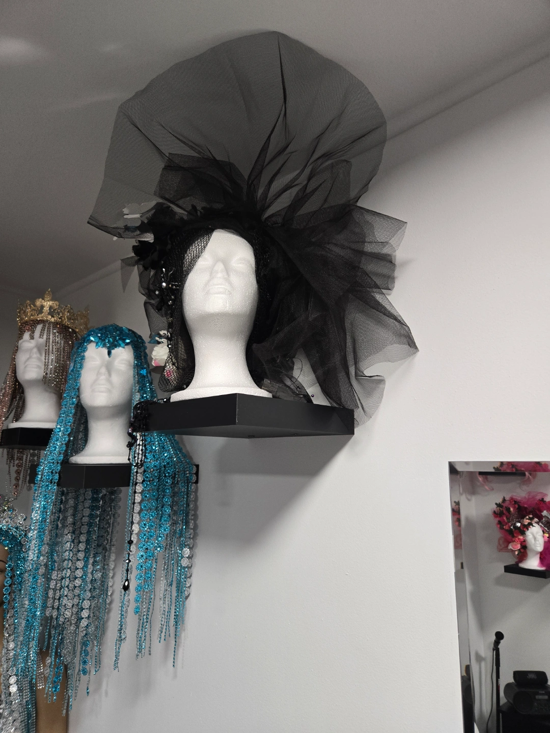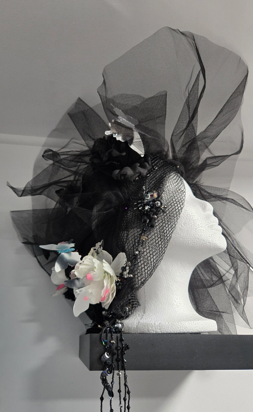 Unique black headpiece. Features large black netting, delicate flowers, and dark embellishments. Perfect for a showgirl, drag queen, or theatrical performance. Eye-catching and dramatic. Costume Design by Natasha Berezhnaya ✨️