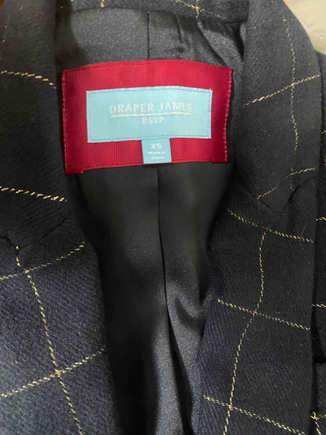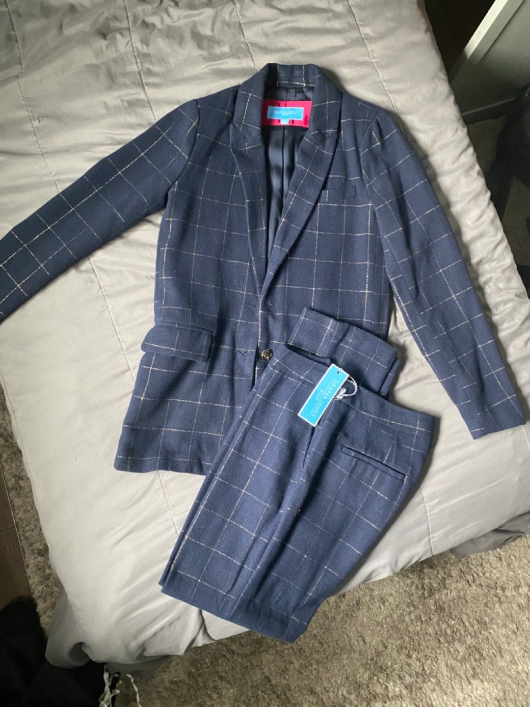 Navy blue blazer and pants set. Gold grid pattern. Size extra small. RSVP line by Draper James. Just lost a button, but I don't think it's a problem because it looks fantastic and can be solved.