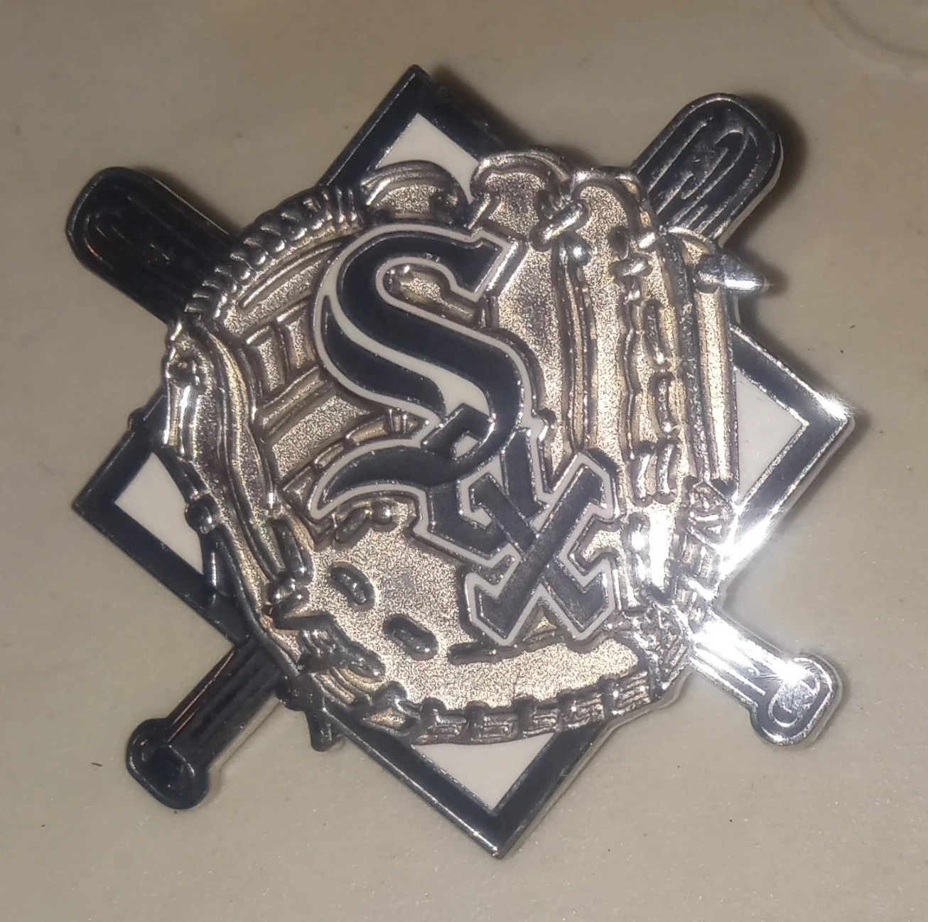 This metal lapel pin features the Chicago White Sox logo with crossed baseball bats and a baseball glove. It's a great accessory for any fan! The pin measures approximately 1.5 inches wide.