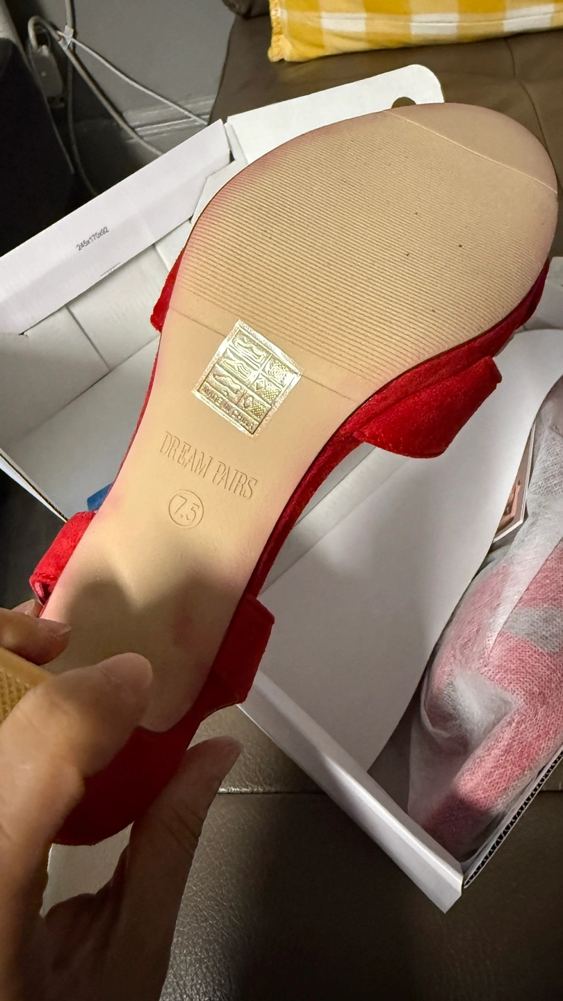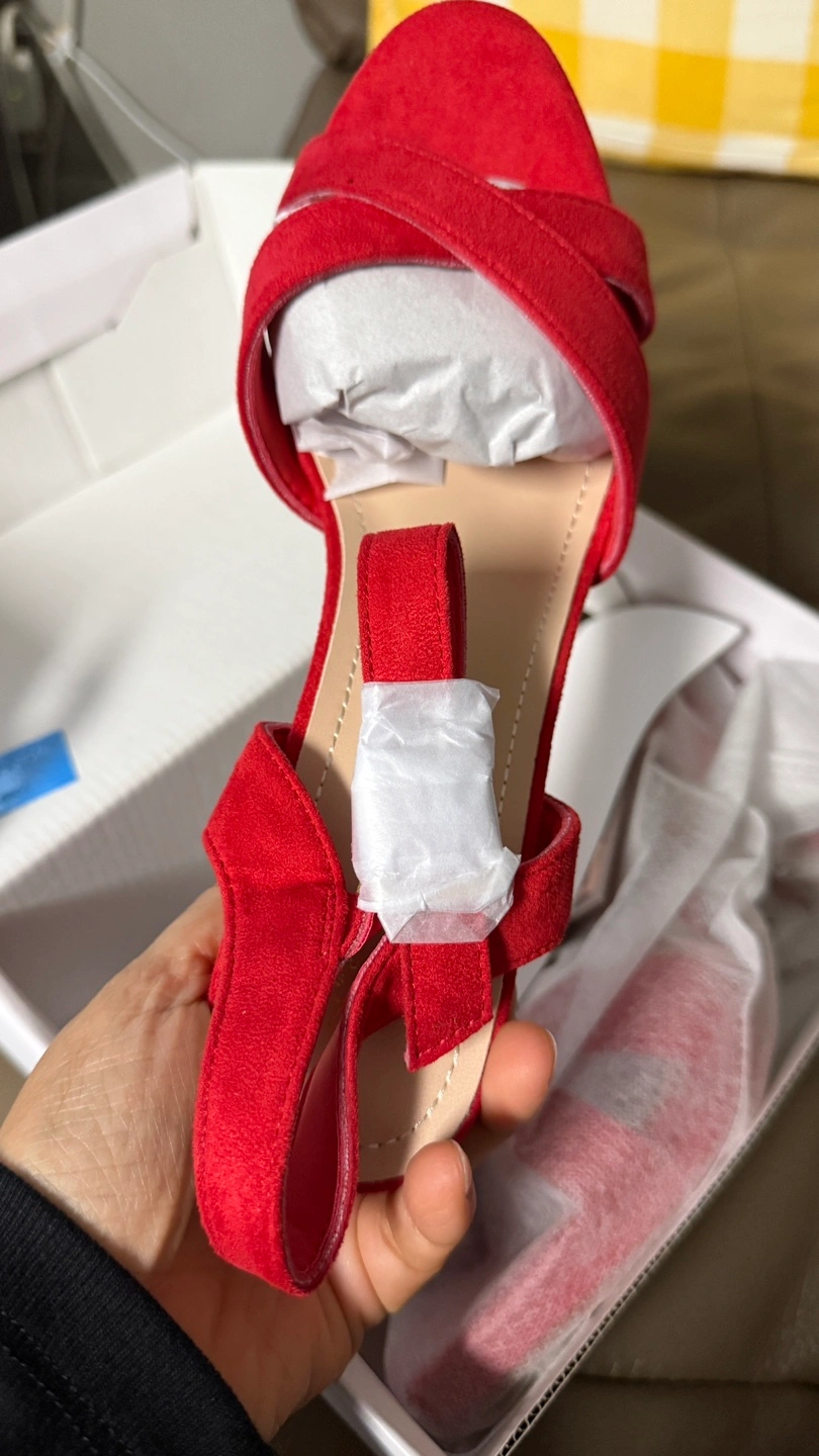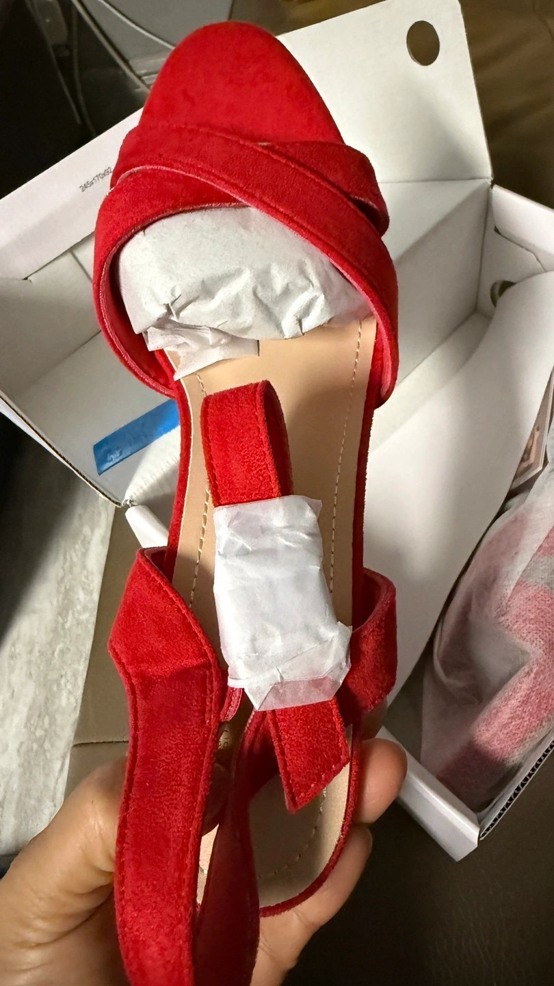 Red suede heels. Ankle strap. Size 7.5. New in box. Slight imperfections from storage.