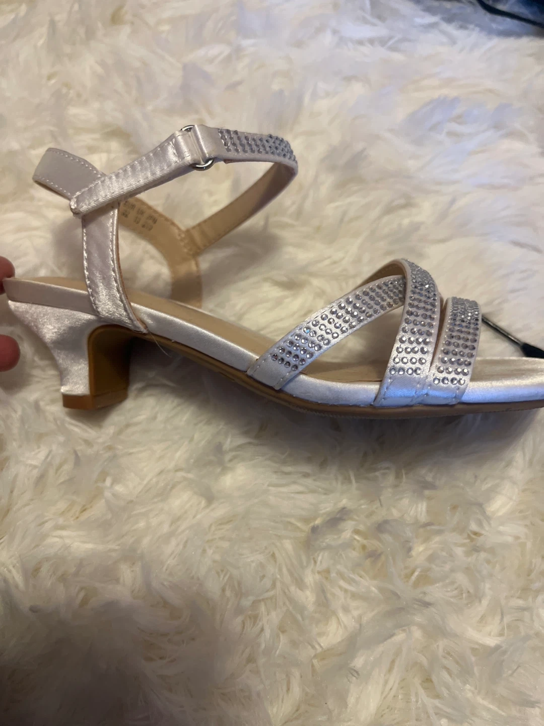 These are a pair of adorable Dream Pairs sandals in a shiny silver color! They feature cute rhinestone detailing on the straps. The size is a US size 1. Perfect for a special occasion!