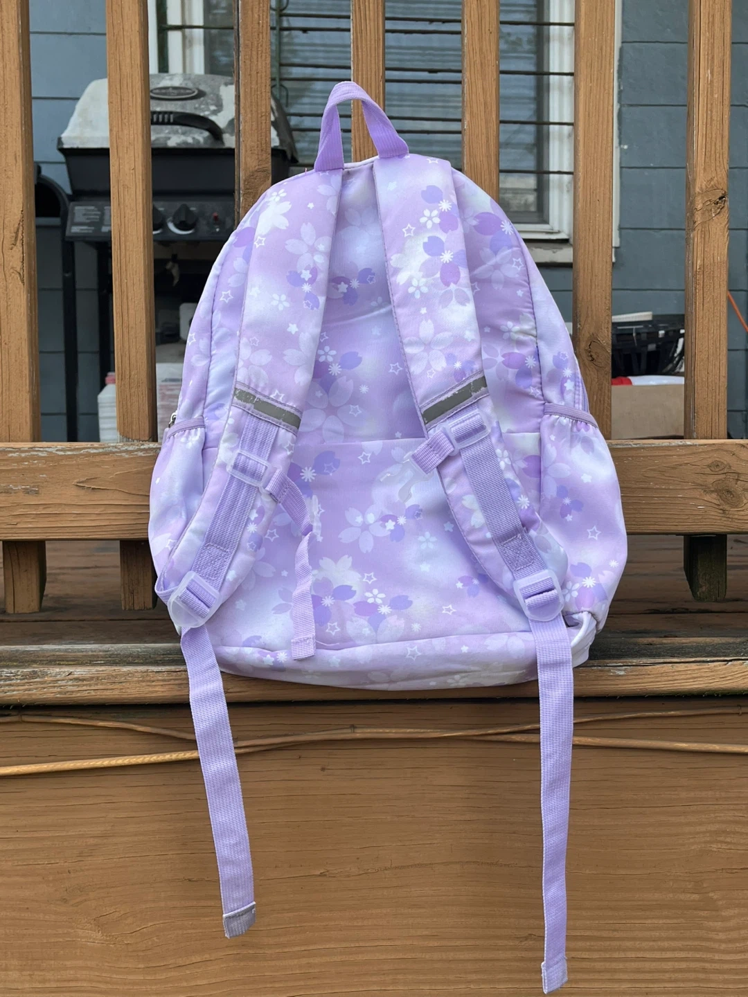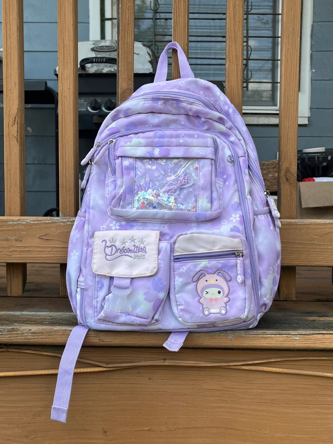 This is a cute lavender floral backpack by Dreamlikes! It has multiple pockets and compartments, perfect for school or travel. The backpack features a unique design with a bunny character and a clear pocket filled with glittery decorations. It's in great condition and ready for a new owner