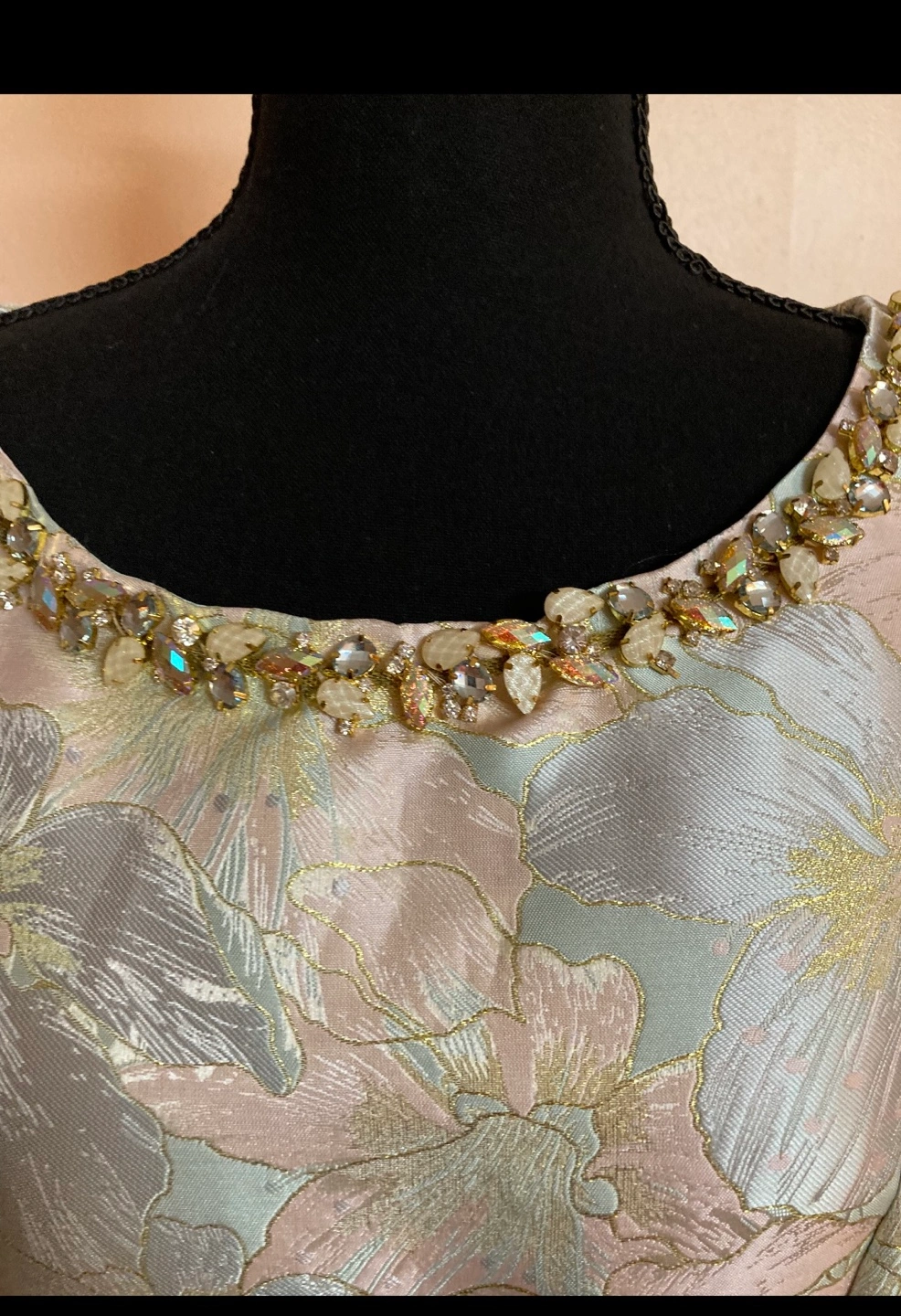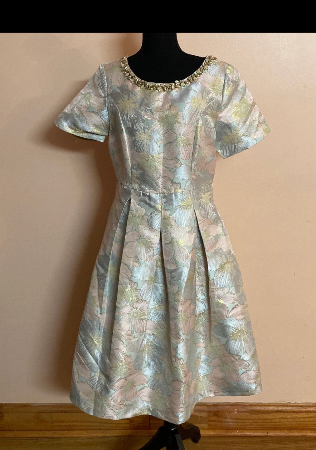 This Adrianna Papell dress is a beautiful addition to any wardrobe! It features a lovely floral pattern and a jeweled neckline. The dress is a size 12 and is in great condition. Perfect for a special occasion or a night out!