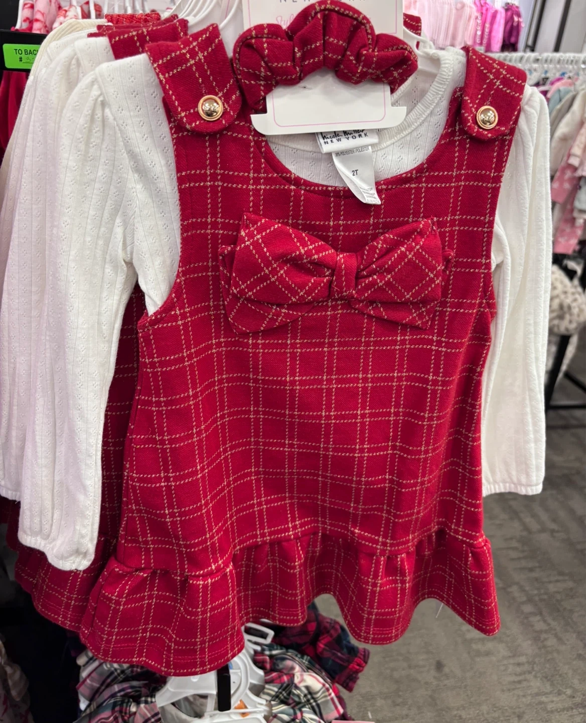 65dress set comes with a long-sleeved white shirt, a red plaid dress with a bow, and a matching headband! The dress is size 2T and made of 95% polyester