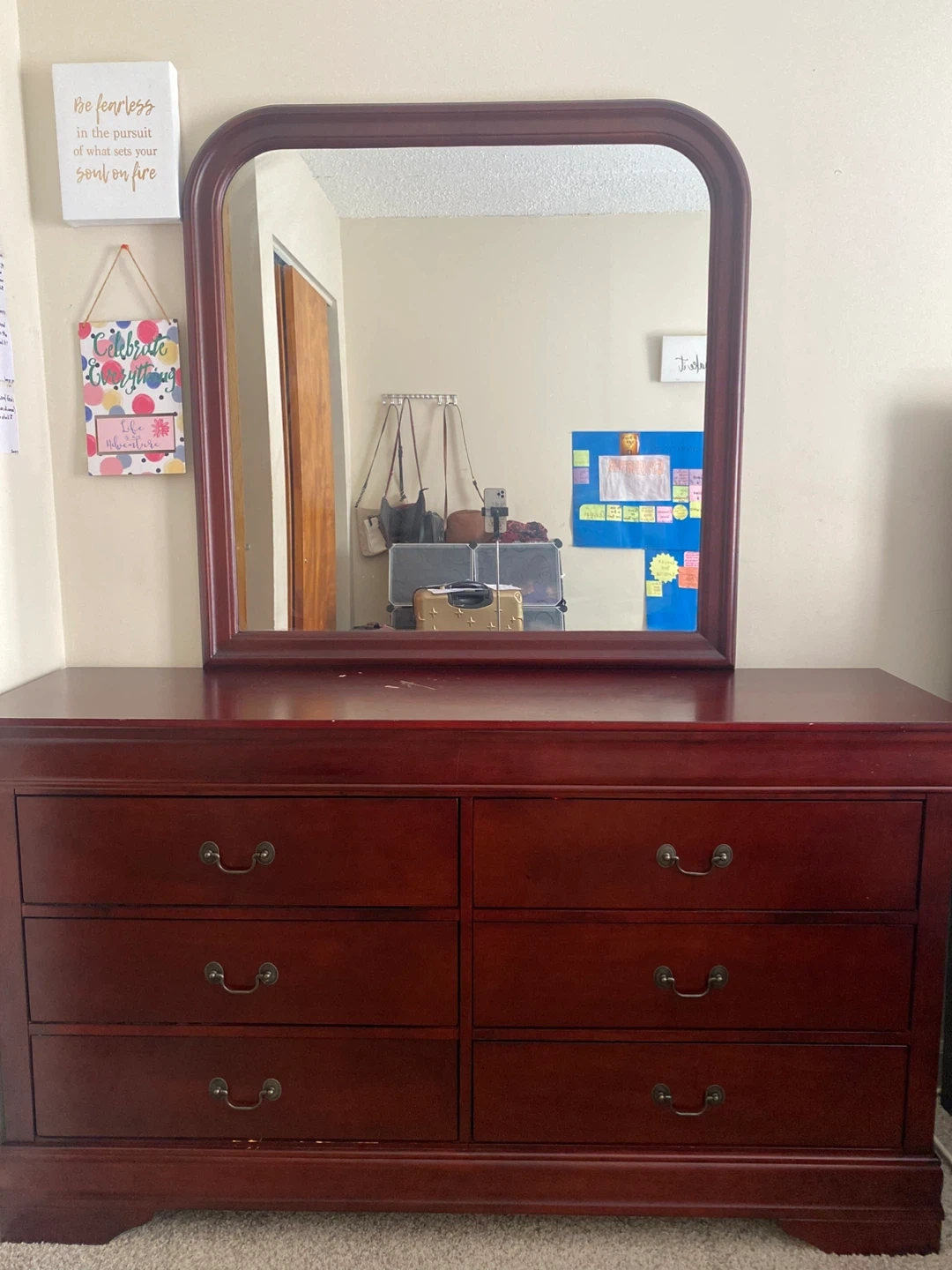 106 Drawer Dresser with attached mirror, made of solid wood in a rich cherry finish. Clean and functional Good used condition. (minor scratches and scuffs on the top surface and lower trim). Dresser: Width: 58inches Height: 33inches Depth: 16 inches Mirror: Width: 38 inches Height: 38 inches