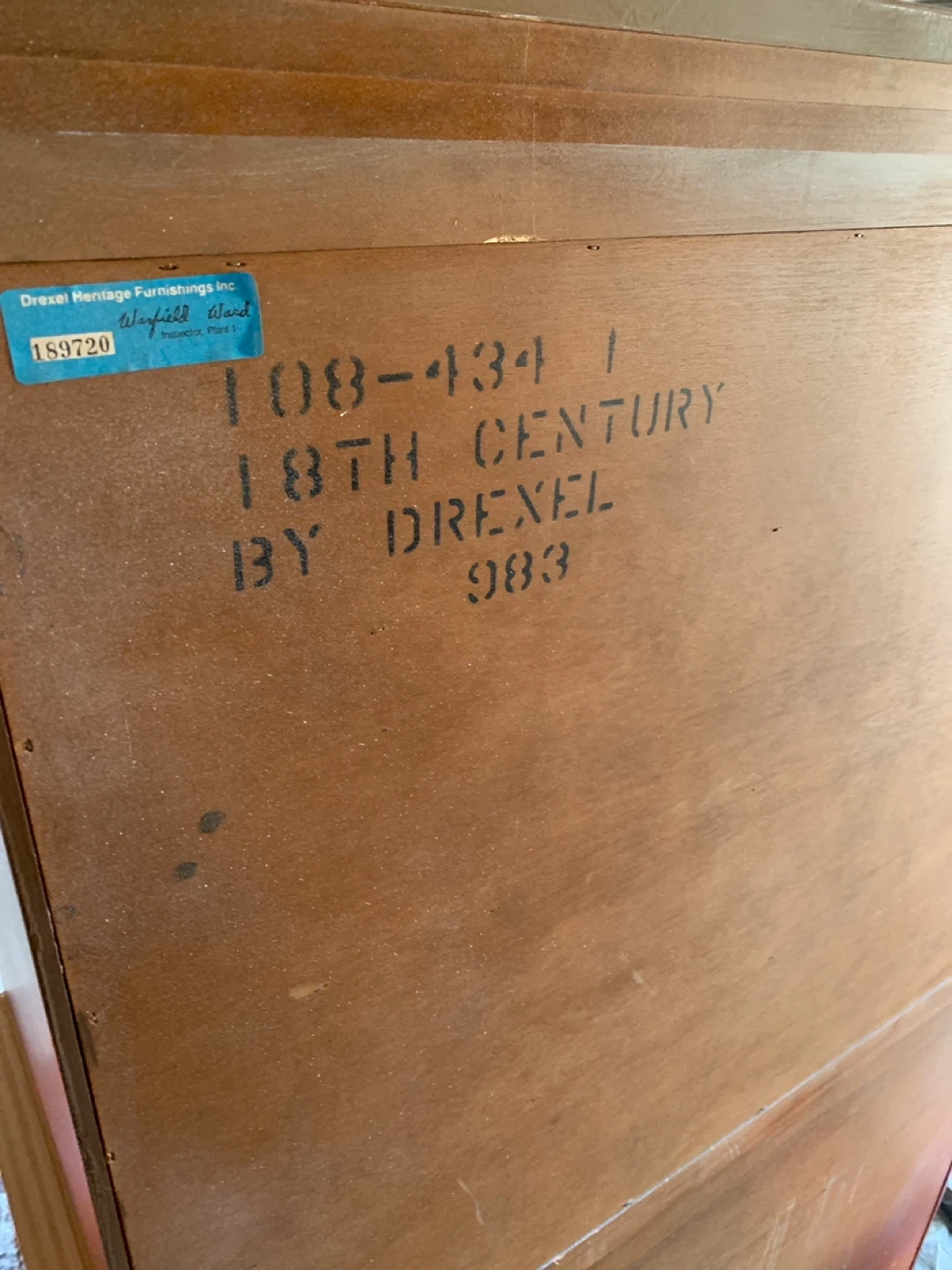 Selling a Drexel Heritage chest of drawers from the 18th Century collection. It's a beautiful piece that would add a touch of elegance to any room. The color is a warm brown, and the hardware is ornate. This is a great piece of furniture!
