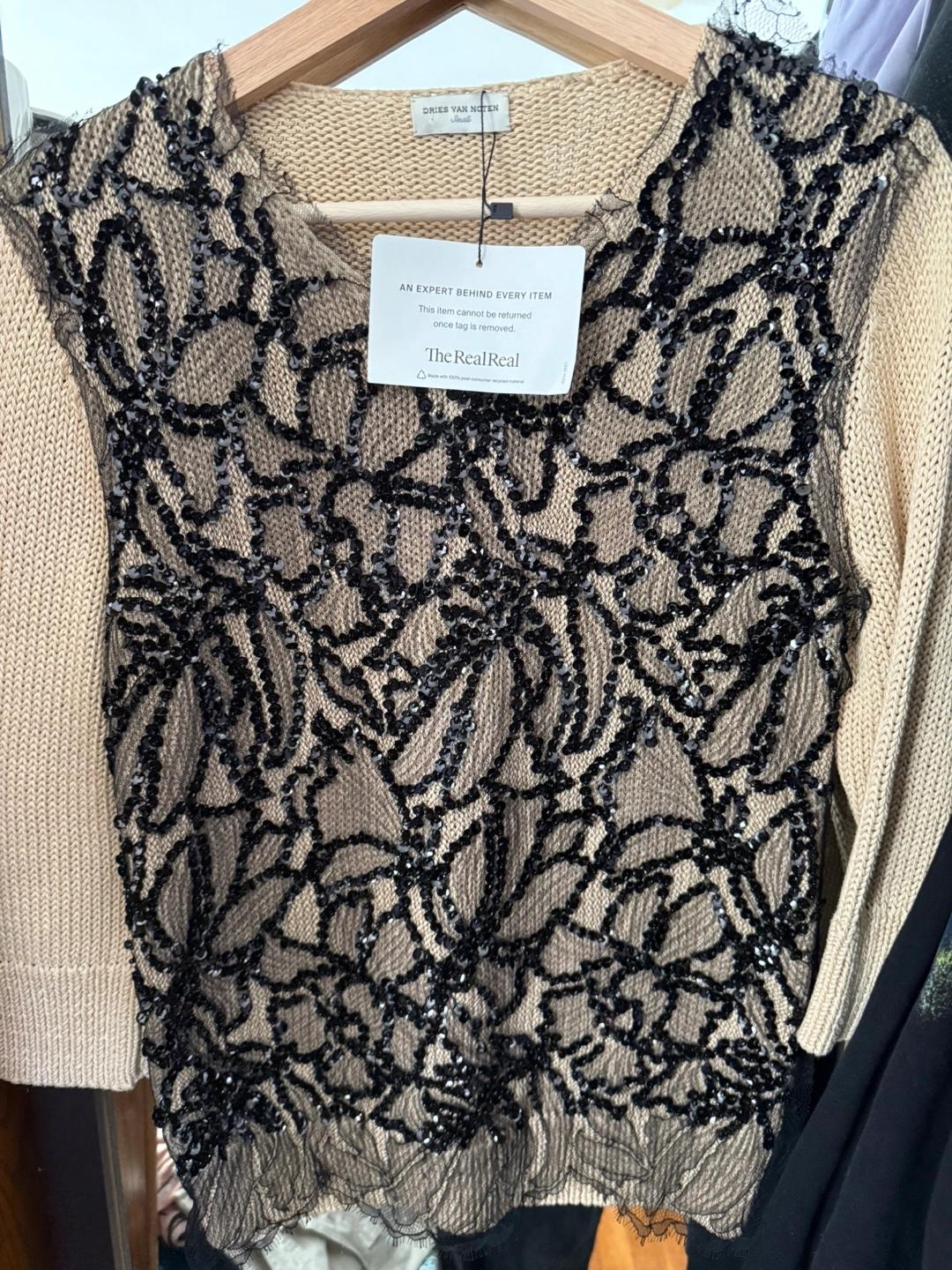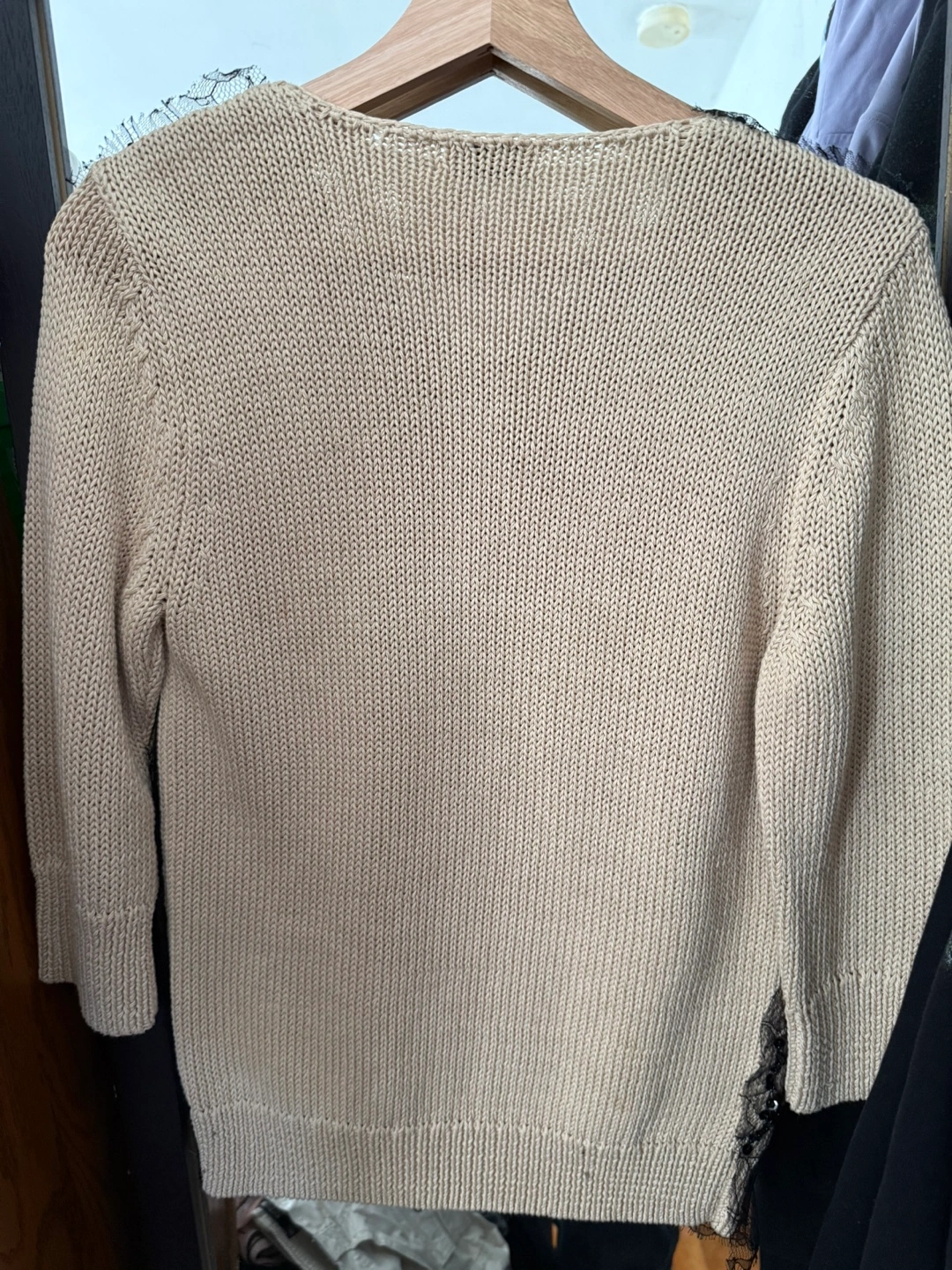 15Beige sweater, black lace trim. Embellished with sequins. Three-quarter sleeves. Excellent condition.