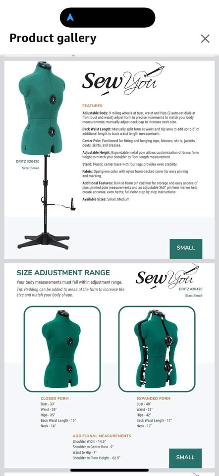 BRAND NEW!!! Missed Amazon return deadline. Originally purchased for $140. Selling for $120 OBO. Dritz Sew You Adjustable Dress Form S/M, Sizes US 4–12, Female Sewing Mannequin with Pinnable Body Torso, 12 Dials for Accurate Fitting & 360 Hem Guide Brand Dritz Color Opal Green Size Small Material Plastic Item Weight 9.4 Pounds Waist (cm) 26 Inches ADUSTABLE BODY: 9 rolling wheels at bust, waist and hips (2 auto-set dials at front bust and waist) adjust form in precise increments to match your body measurements; manually adjust neck cap to increase neck size BACK WAIST LENGTH: Manually split form at waist and hip area to add up to 2” of additional length to back waist length measurement CENTER POLE: Positioned for fitting and hanging tops, blouses, skirts, jackets, coats, skirts, and dresses ADJUSTABLE HEIGHT: Expandable metal pole allows customization of dress form height to match your shoulder to floor length measurement STAND: Plastic center base with four legs provides even stability