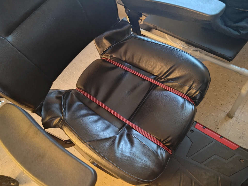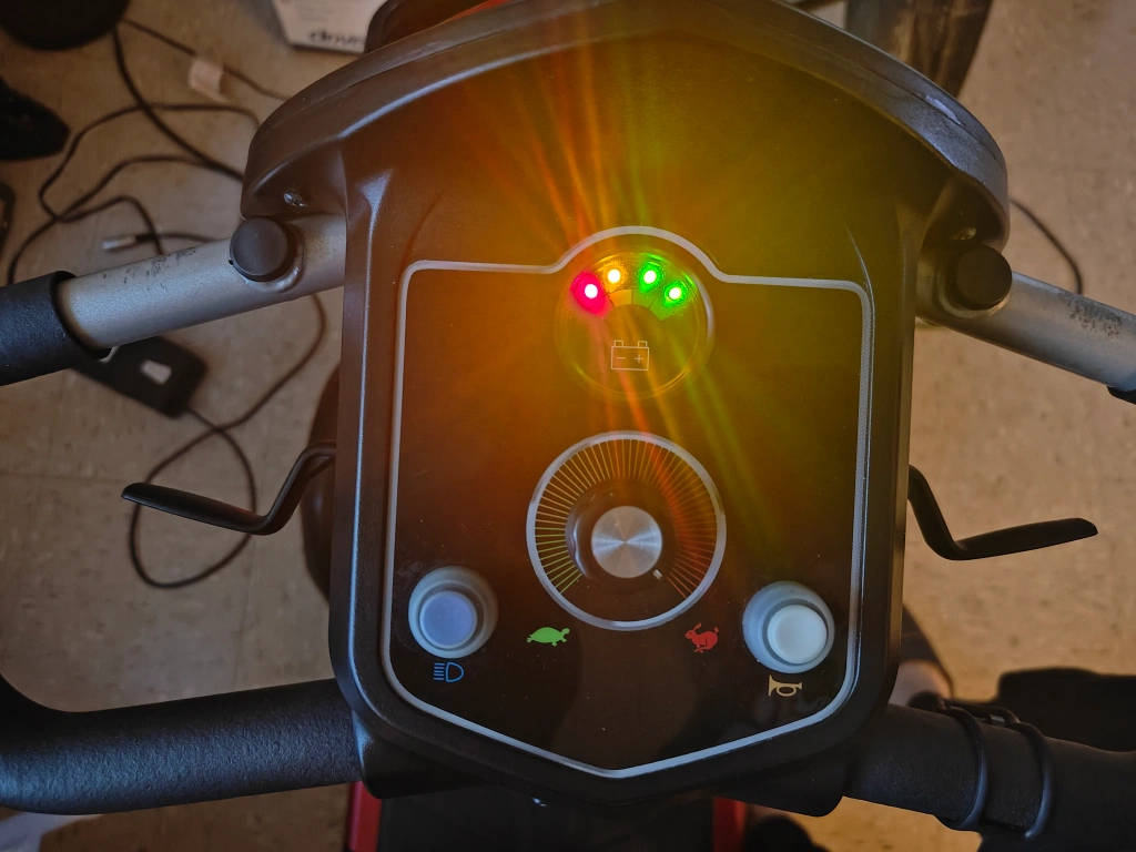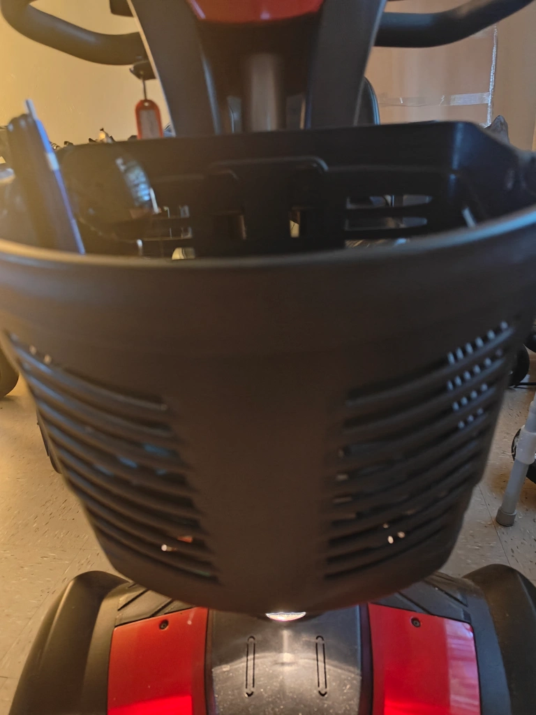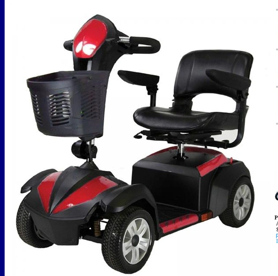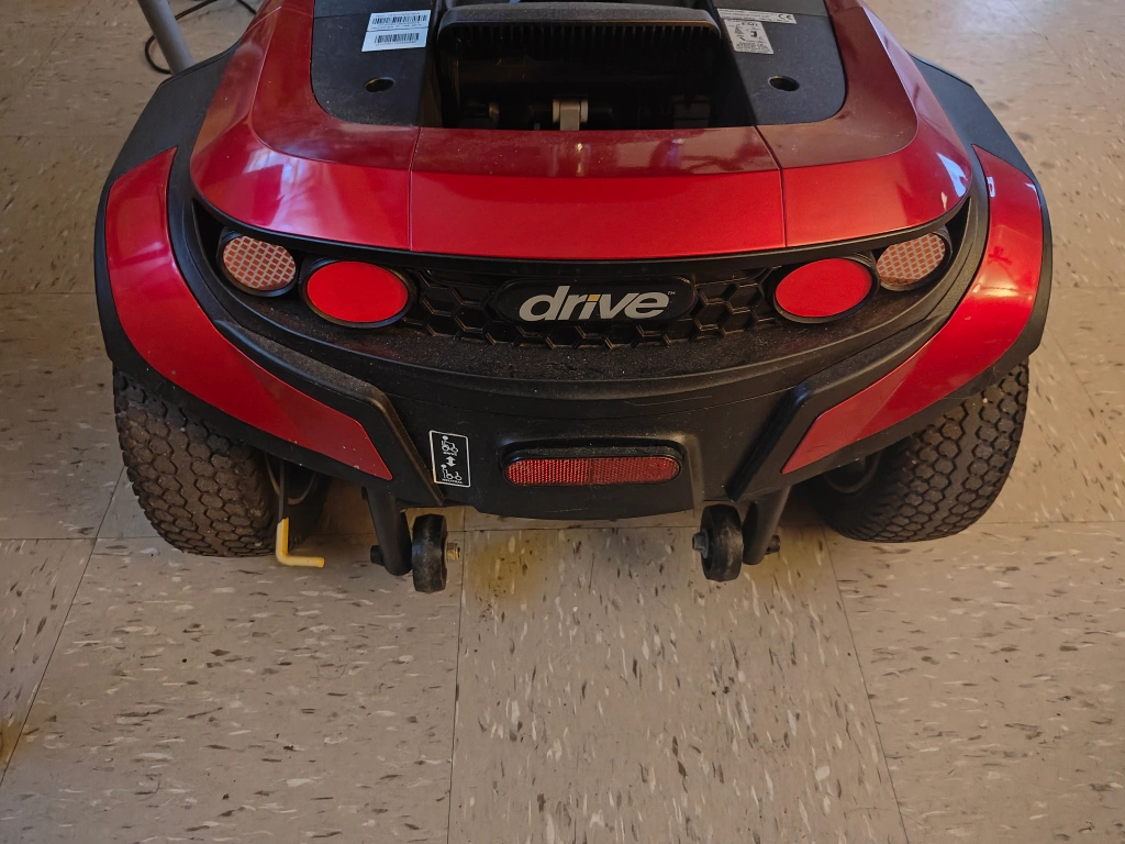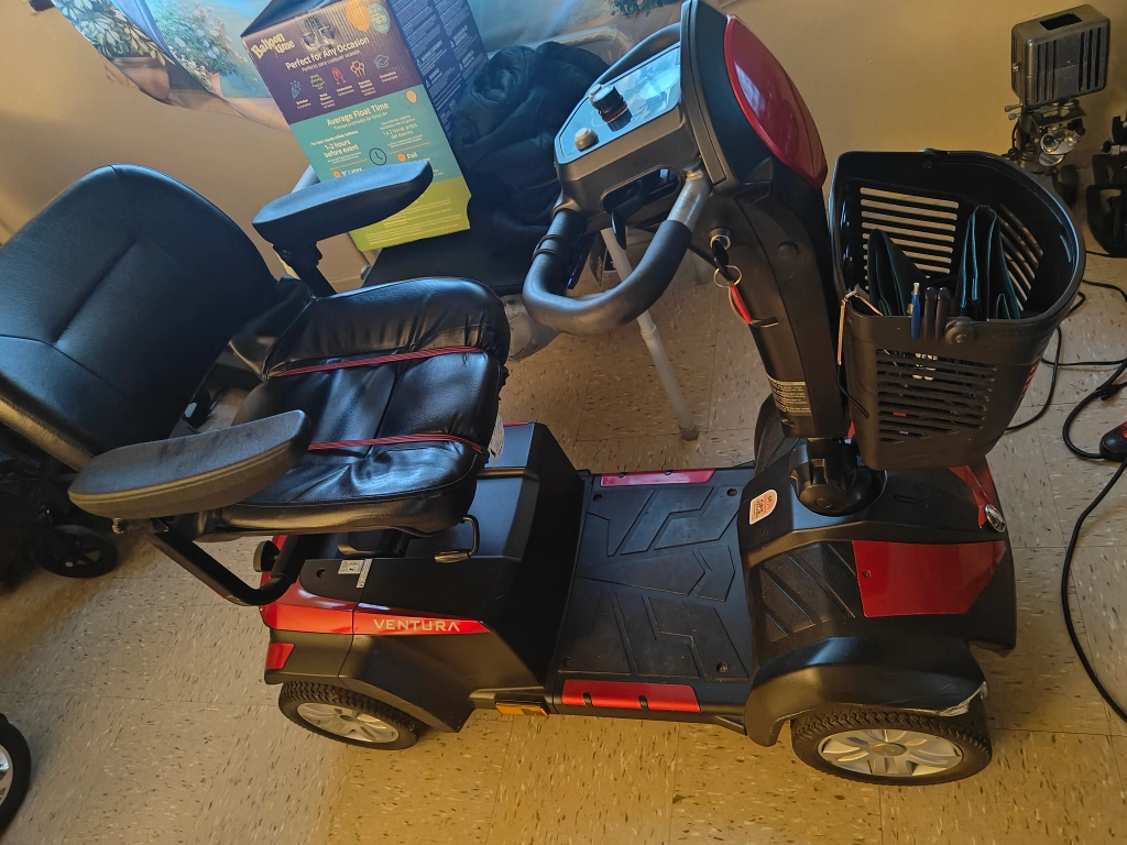 A mobility scooter with a seat and arm rests. The scooter has a front basket and a control panel. The red and black scooter features some lights, and indicators. It's a great way to experience more outdoor adventures while feeling comfortable. heavy duty 400 lb capacity worth $2,500 with tax and shipping use condition some little cracks and scuff marks on the side platform overall good working condition.