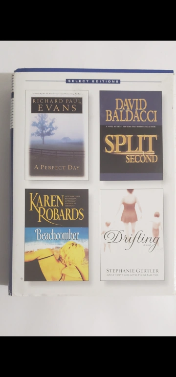 Collection of four novels. Includes: A Perfect Day by Richard Paul Evans, Split Second by David Baldacci, Beachcomber by Karen Robards, and Drifting by Stephanie Gertler. Select Editions.