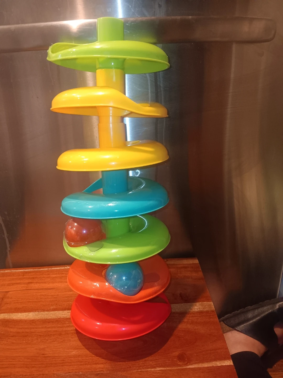 This colorful stacking ball toy features multiple levels for balls to roll down. It includes red, orange, green, yellow, and blue pieces. It's great for developing motor skills!