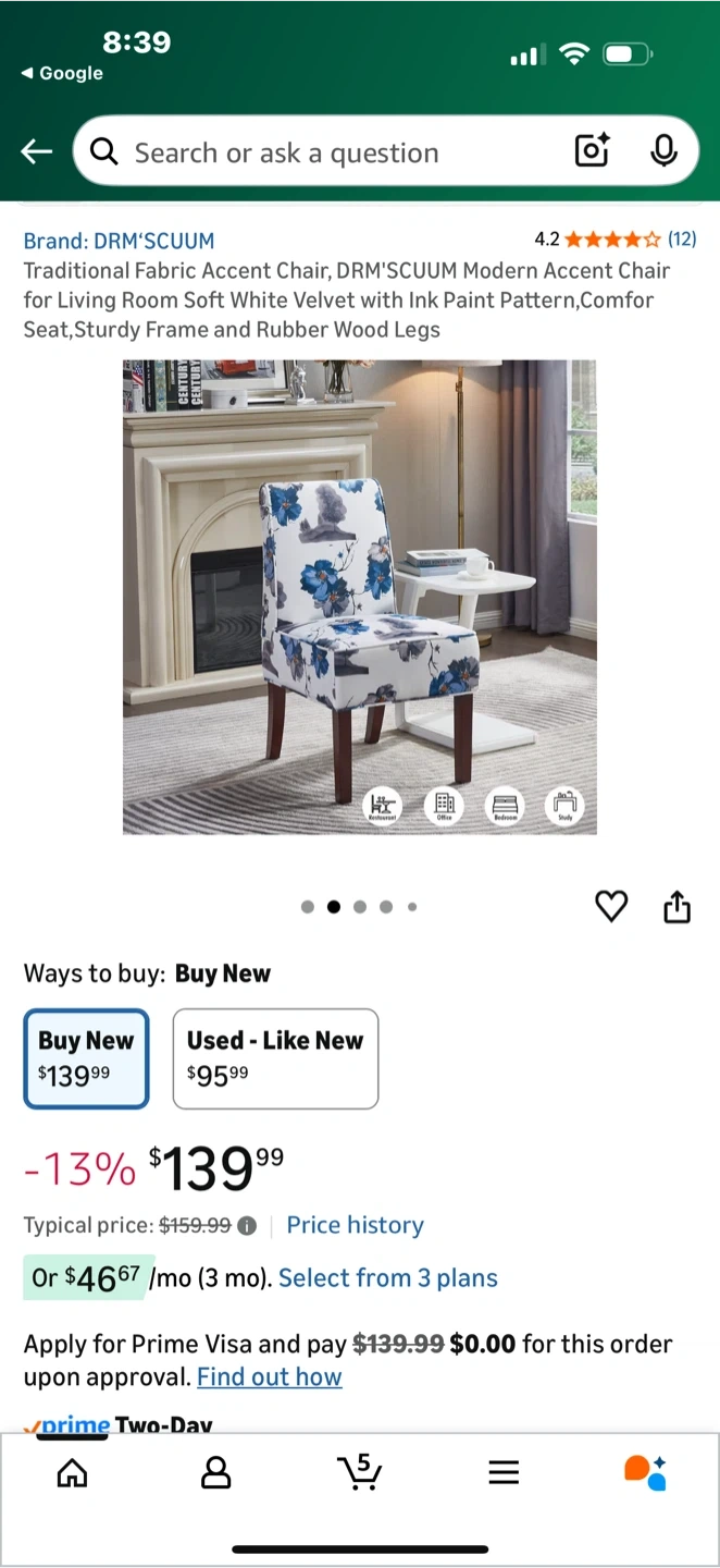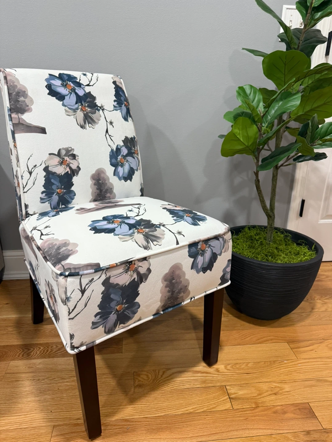 67Here's a traditional fabric accent chair with a floral pattern! It's a DRM'SCUUM modern accent chair for the living room. It features a soft white velvet with ink paint pattern, a comfort seat, a sturdy frame, and rubber wood legs. The dimensions are approximately 16 inches wide, 18 inches deep, and 36 inches tall.