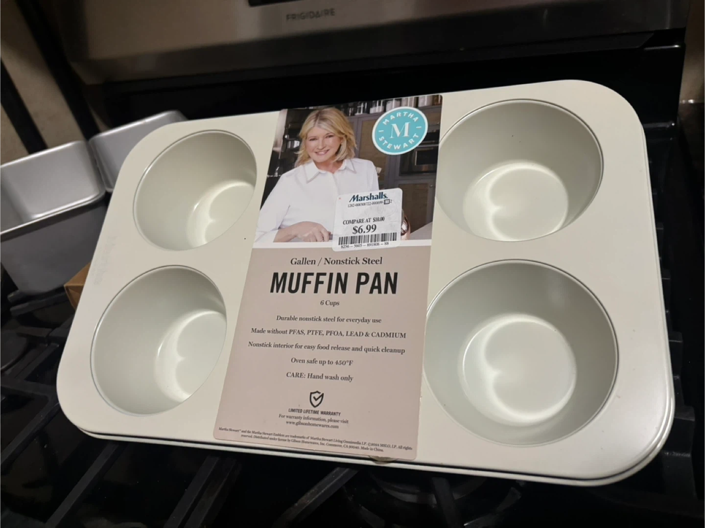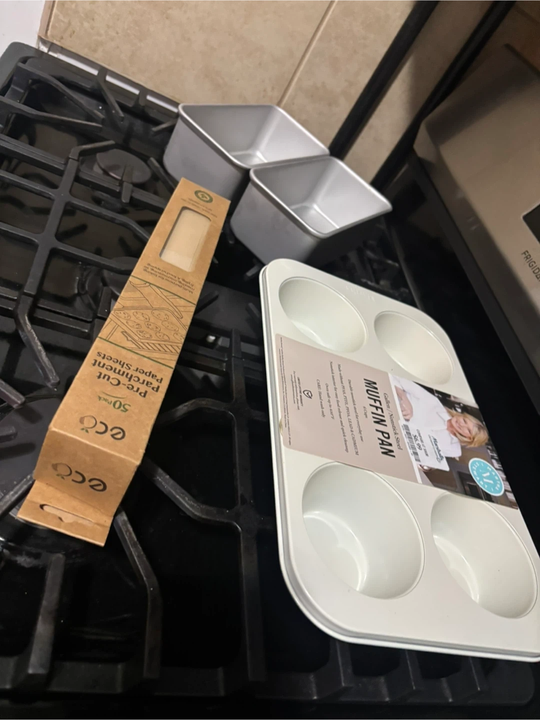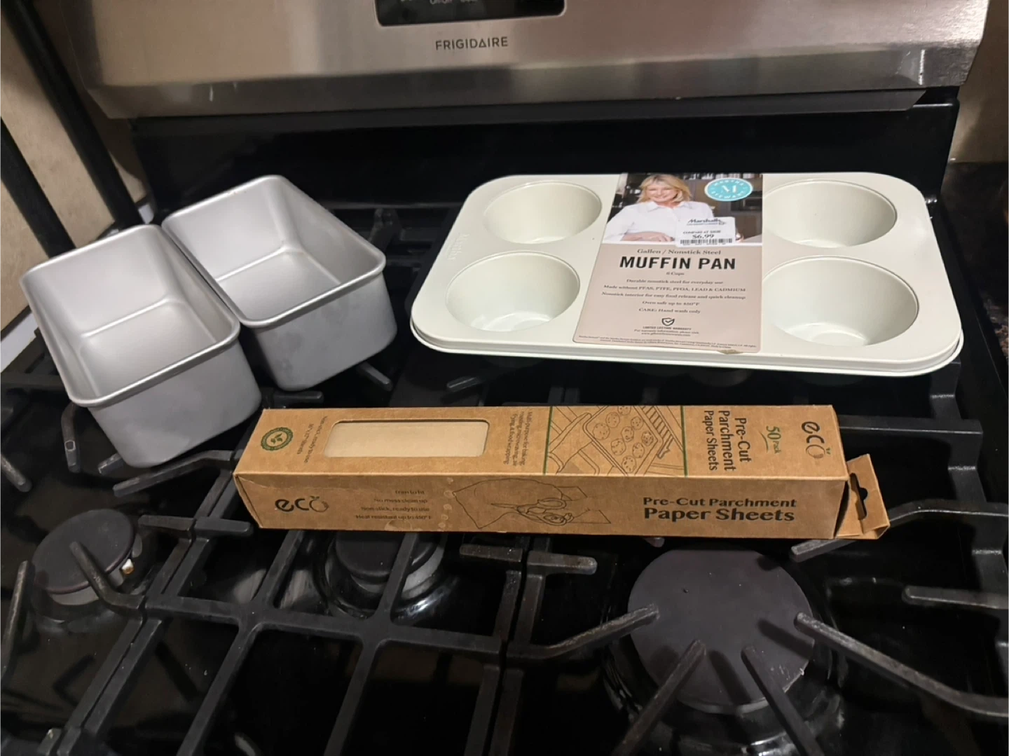 6-cup nonstick muffin pan made of durable tinsteel. Includes two mini loaf pans and a 50-sheet pack of eco-friendly pre-cut parchment paper. Oven safe up to 450°F.