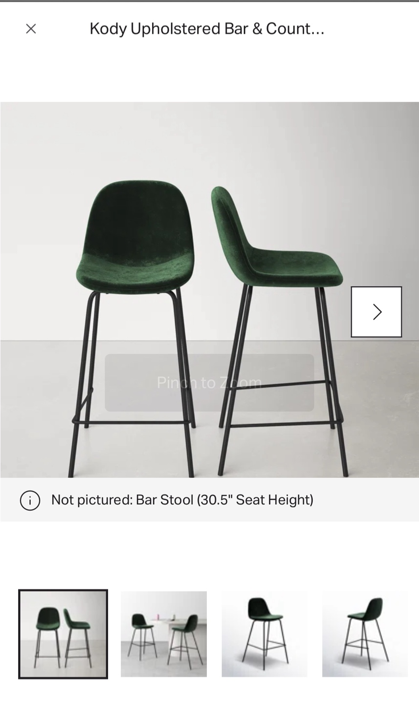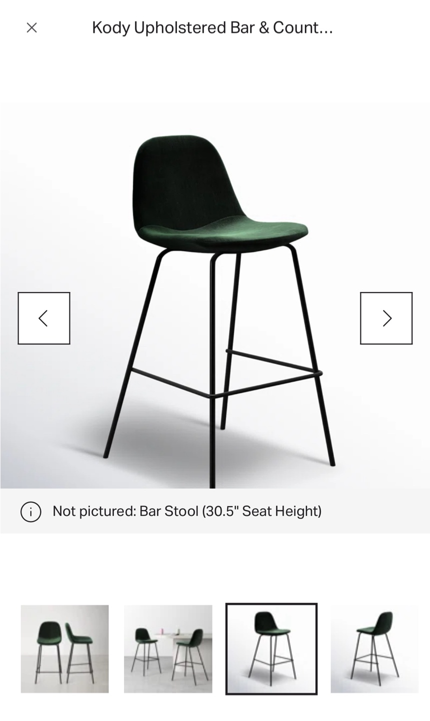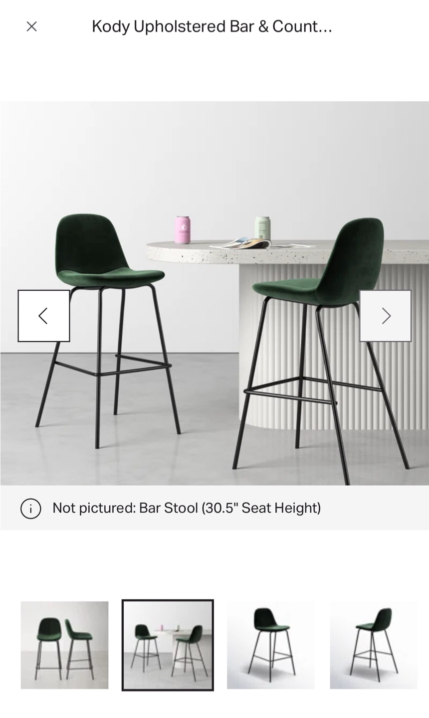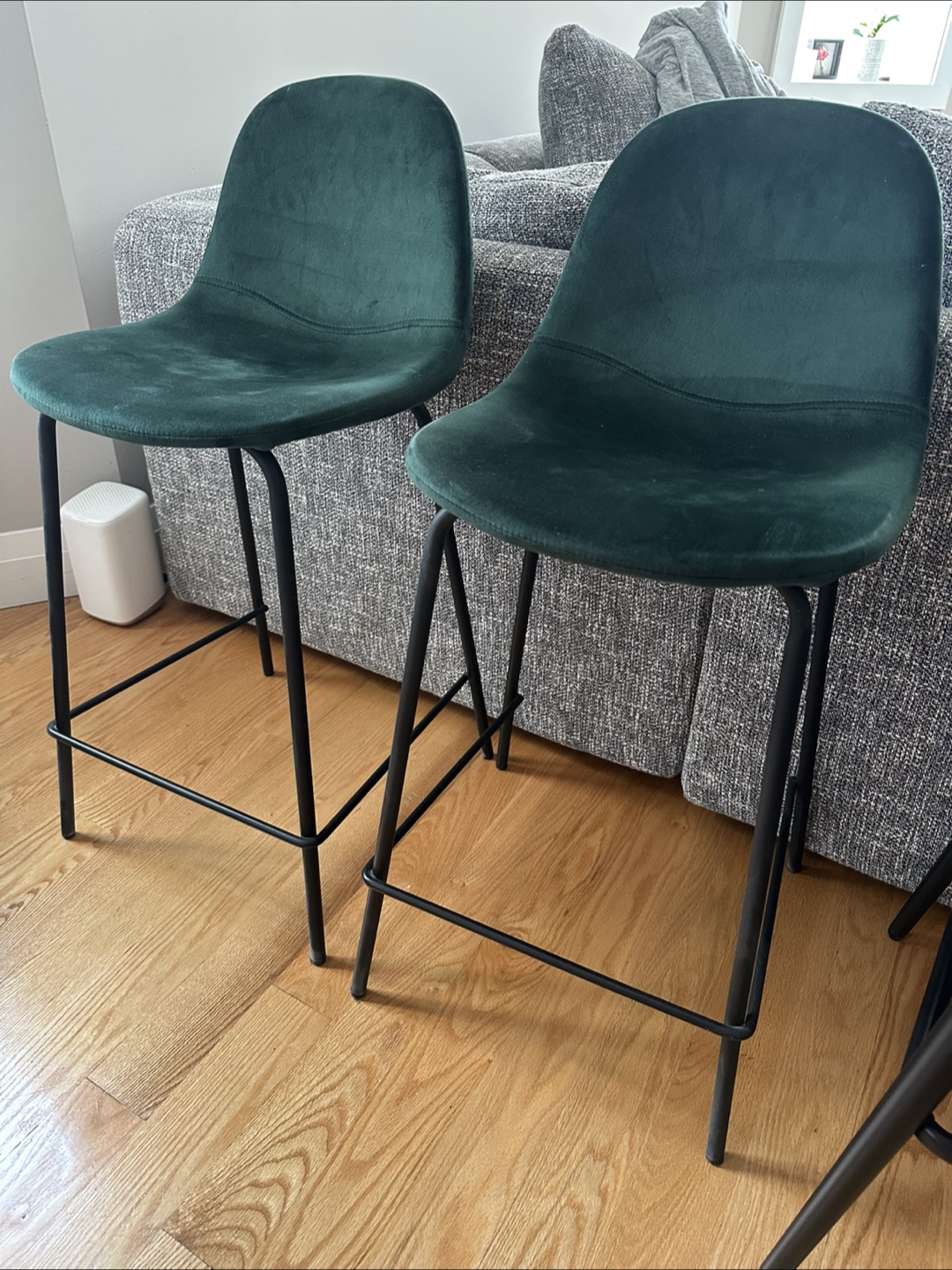 Counter height stools. Green velvet seat. Black legs. Enjoy your morning coffee while seated at your kitchen island in these comfortable stools.