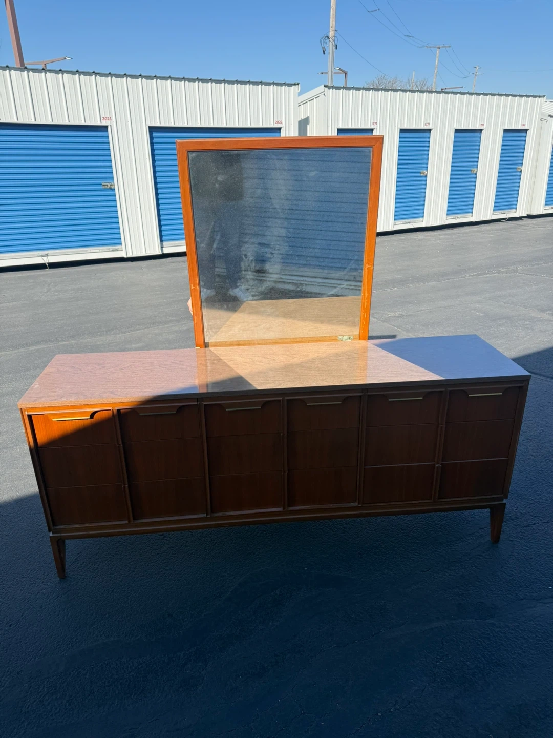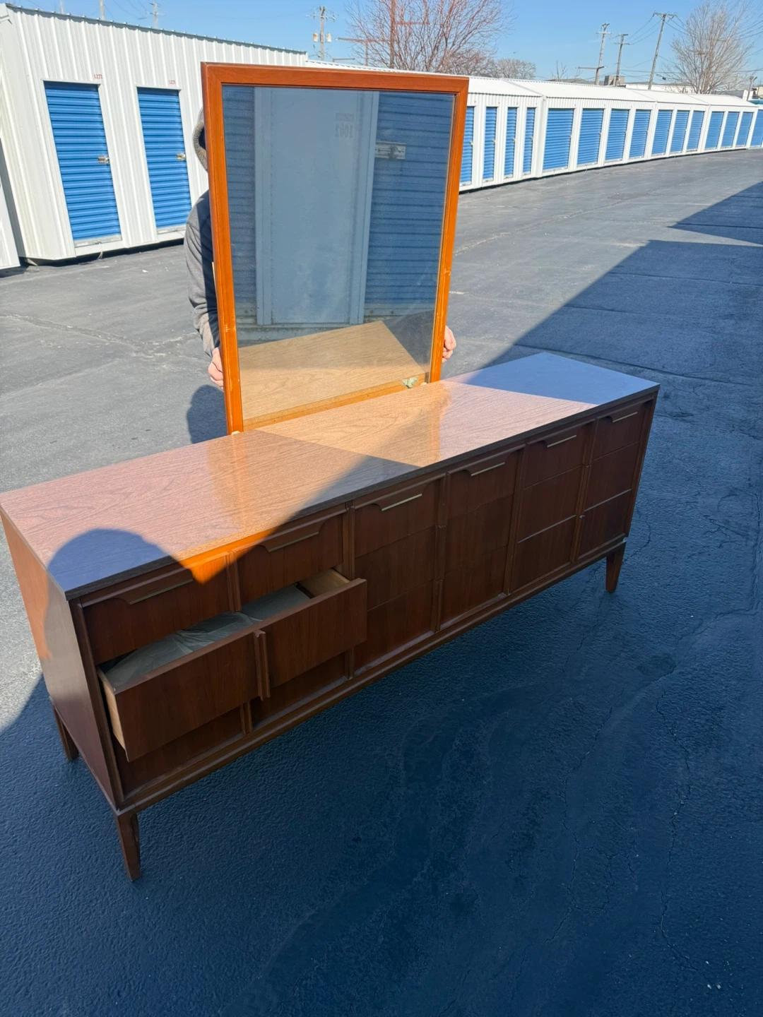 This vintage dresser features a warm wood finish and a large attached mirror. It offers ample storage with multiple drawers. The piece has a classic mid-century modern design, perfect for adding style to a bedroom.