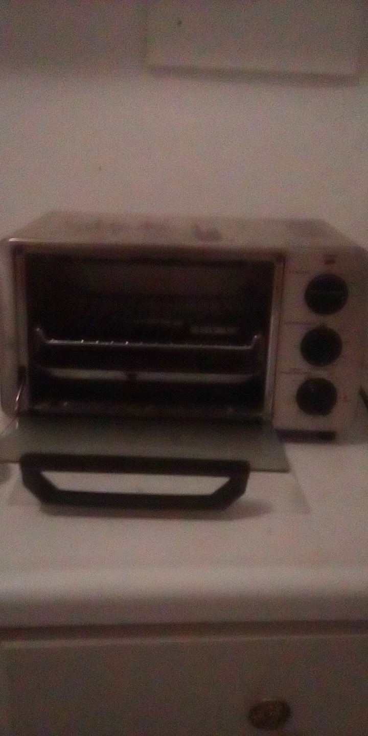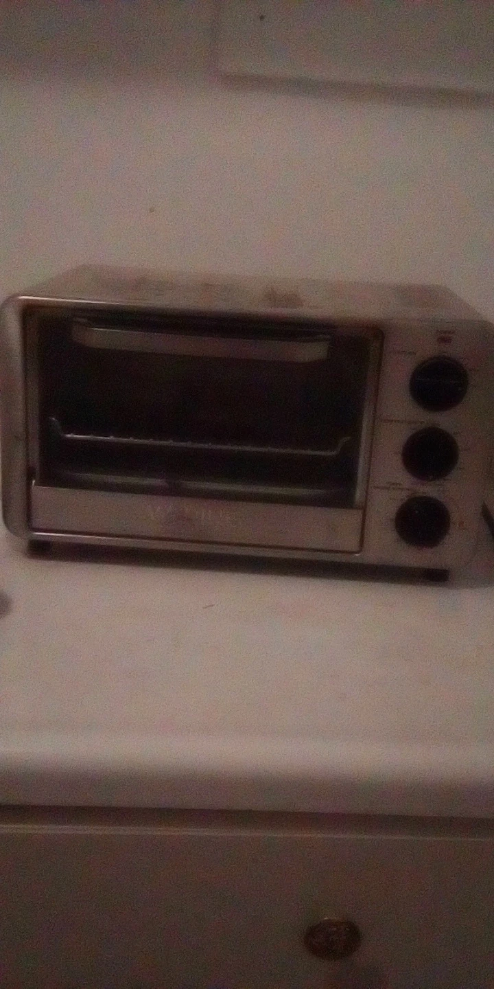 This is a Black+Decker toaster oven. It's a compact appliance for your kitchen counter. Its three knobs control temperature and timer settings.