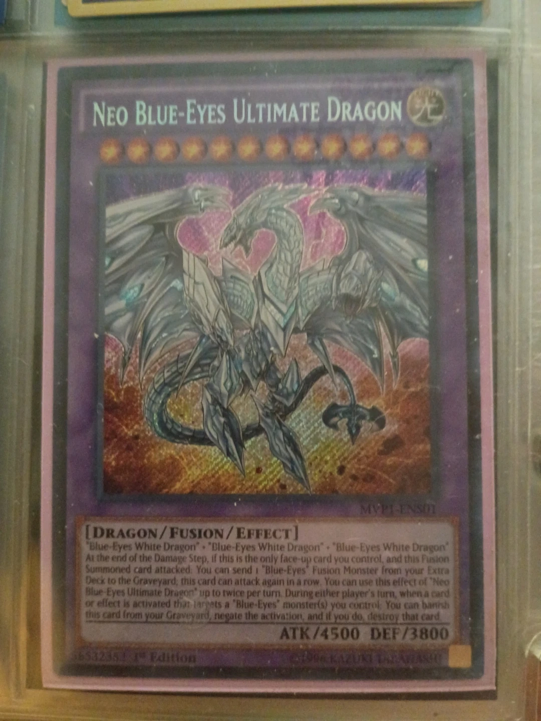 This is the Neo Blue-Eyes Ultimate Dragon card from Yu-Gi-Oh!. It's a Fusion/Effect monster with 4500 ATK and 3800 DEF. This is a 1st Edition card.
